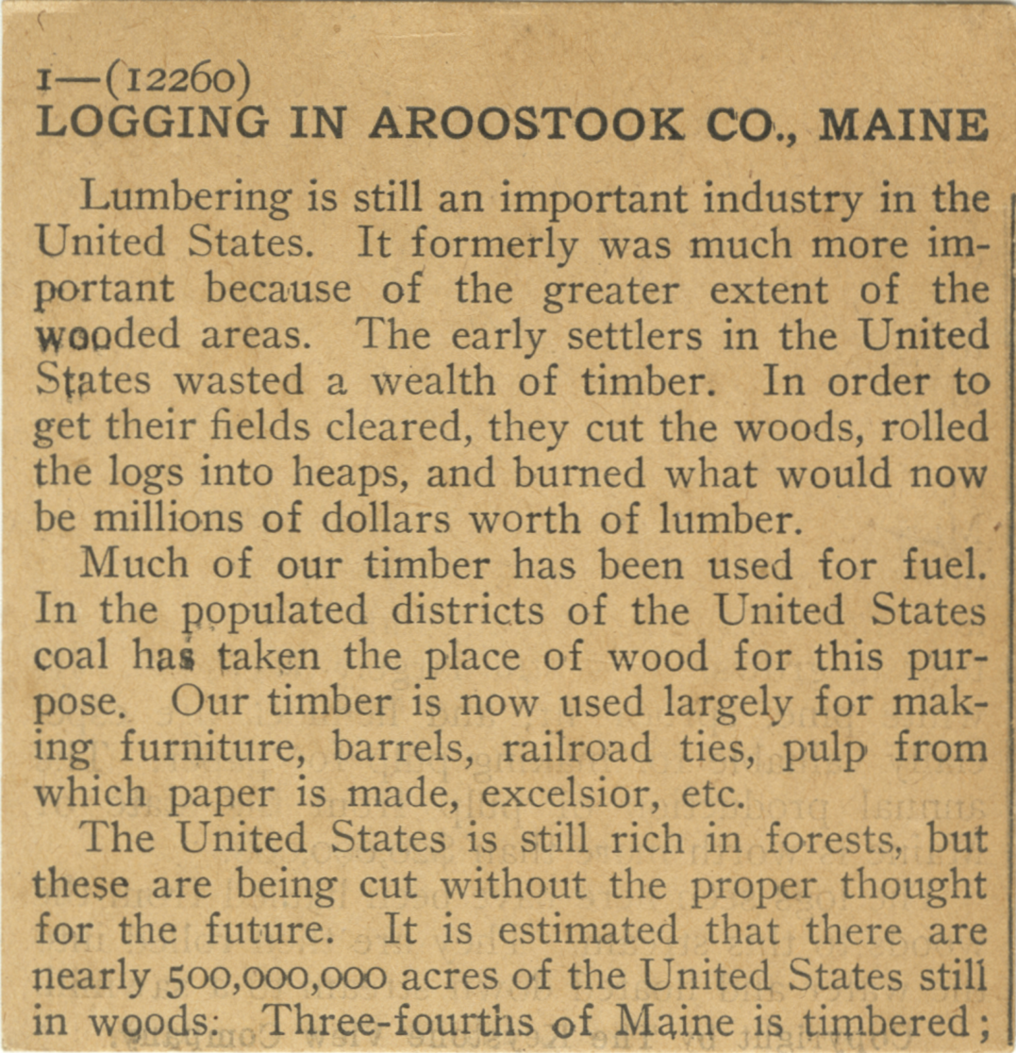 Lumbering is still an important industry in the United States. It formerly was much more important because of the greater extent of the wooded areas. The early settlers in the United States wasted a wealth of timber. In order to get their fields cleared, they cut the woods, rolled the logs into heaps, and burned what would now be millions of dollars worth of lumber. Much of our timber has been used for fuel. In the populated districts of the United States coal has taken the place of wood for this purpose. Our timber is now used largely for making furniture, barrels, railroad ties, pulp from which paper is made, excelsior, etc. The United States is still rich in forests, but these are being cut without the proper thought for the future. It is estimated that there are nearly 500,000,000 acres of the United States still in woods. Three-fourths of Maine is timbered;