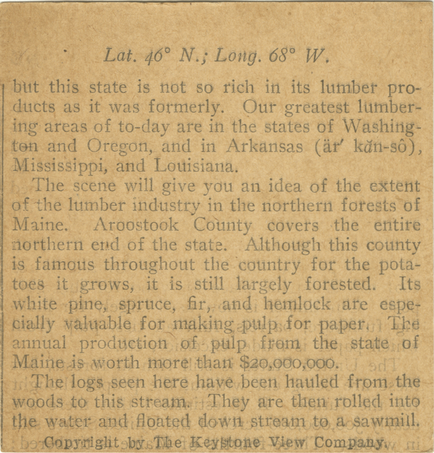 but this state is not so rich in its lumber products as it was formerly. Our greatest lumbering areas of to-day are in the states of Washington and Oregon, and in Arkansas, Mississippi, and Louisiana. The scene will give you an idea of the extent of the lumber industry in the northern forests of Maine. Aroostook County covers the entire northern end of the state. Although this county is famous throughout the country for the potatoes it grows, it is still largely forested. Its white pine, spruce, fir, and hemlock are especially valuable for making pulp for paper. The annual production of pulp from the state of Maine is worth more than $20,000,000. The logs seen here have been hauled from the woods to this stream. They are then rolled into the water and floated down stream to a sawmill.