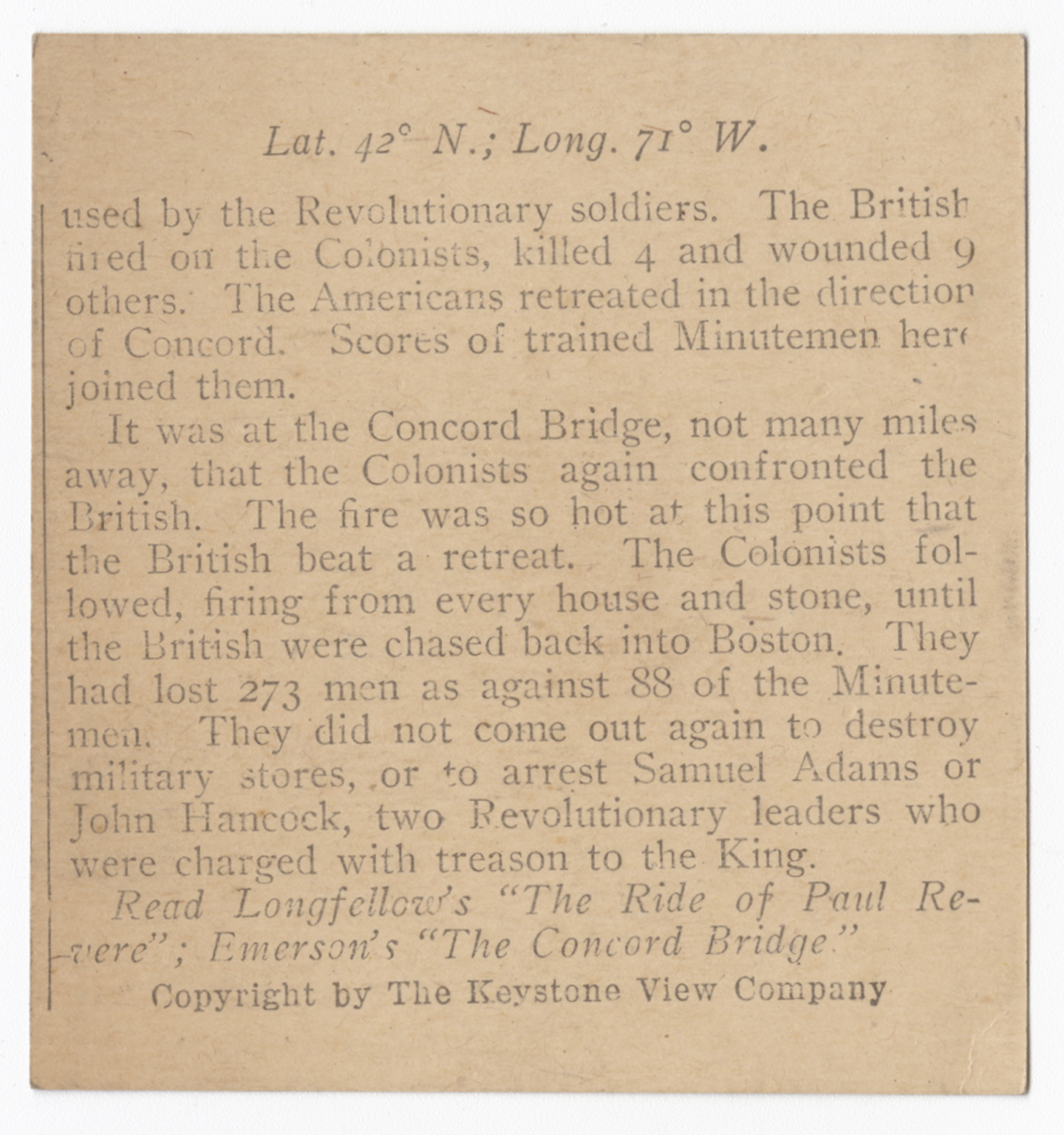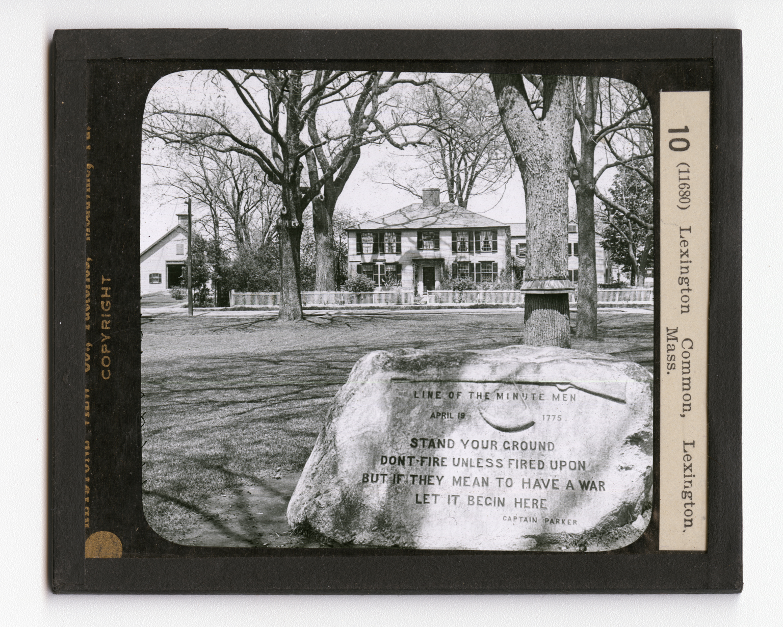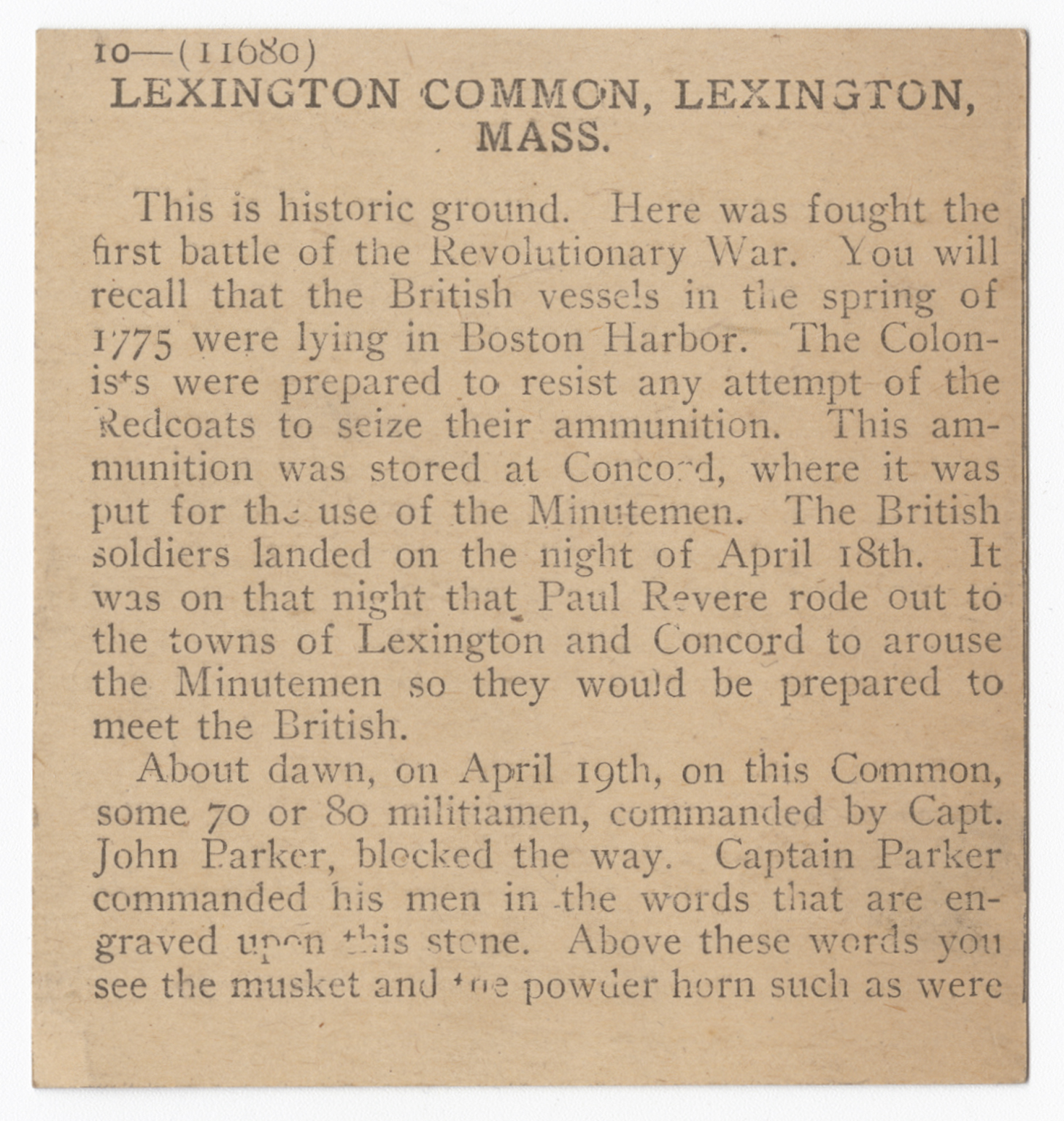 This is historic ground. Here was fought the first battle of the Revolutionary War. You will recall that the British vessels in the spring of 1775 were lying in Boston Harbor. The Colonists were prepared to resist any attempt of the Redcoats to seize their ammunition. This ammunition was stored at Concord, where it was put for the use of the Minutemen. The British soldiers landed on the night of April 18th. It was on that night that Paul Revere rode out to the towns of Lexington and Concord to arouse the Minutemen so they would be prepared to meet the British. About dawn, on April 19th, on this Common, some 70 or 80 militiamen, commanded by Capt. John Parker, blocked the way. Captain Parker commanded his men in the words that are engraved upon this stone. Above these words you see the musket and the powder horn such as were