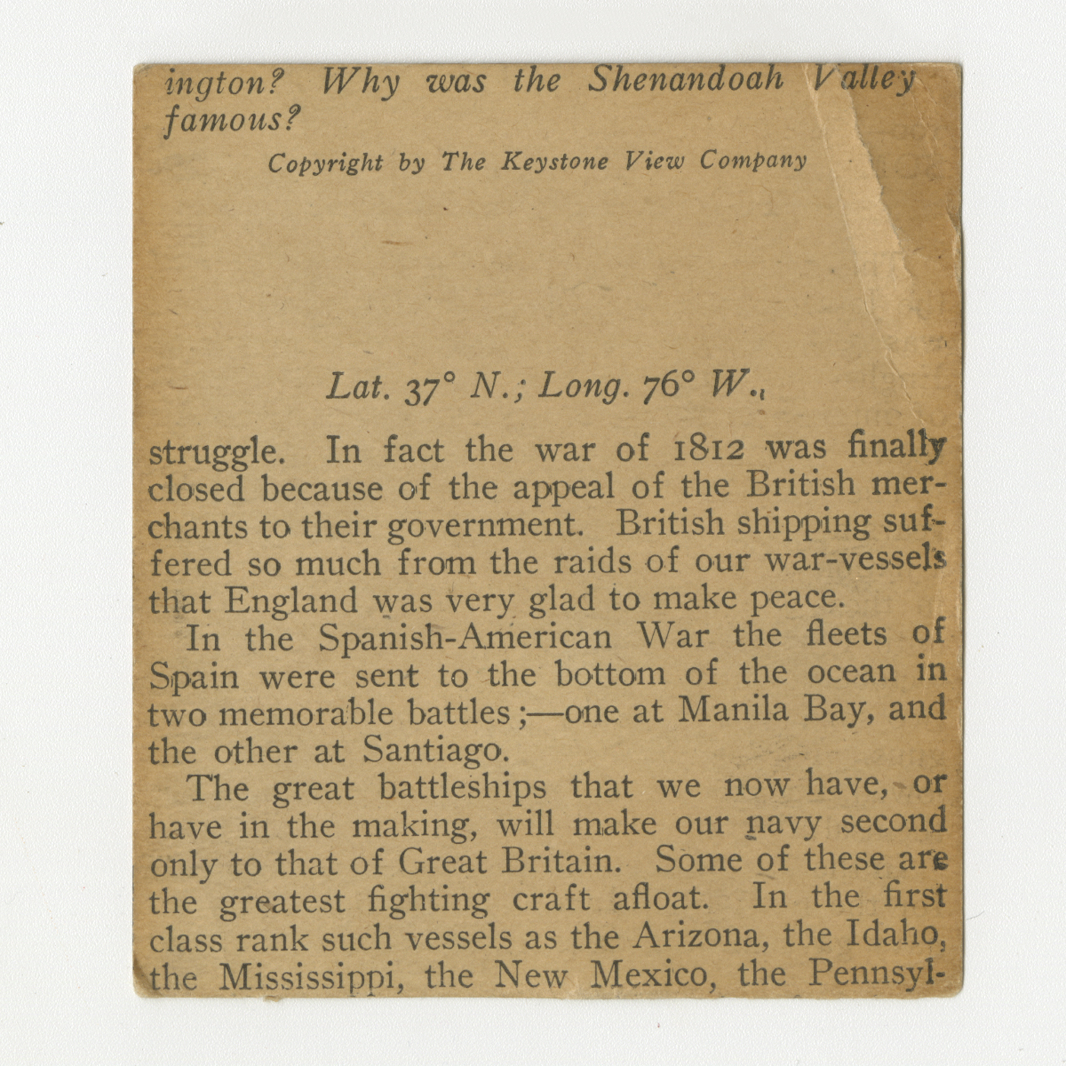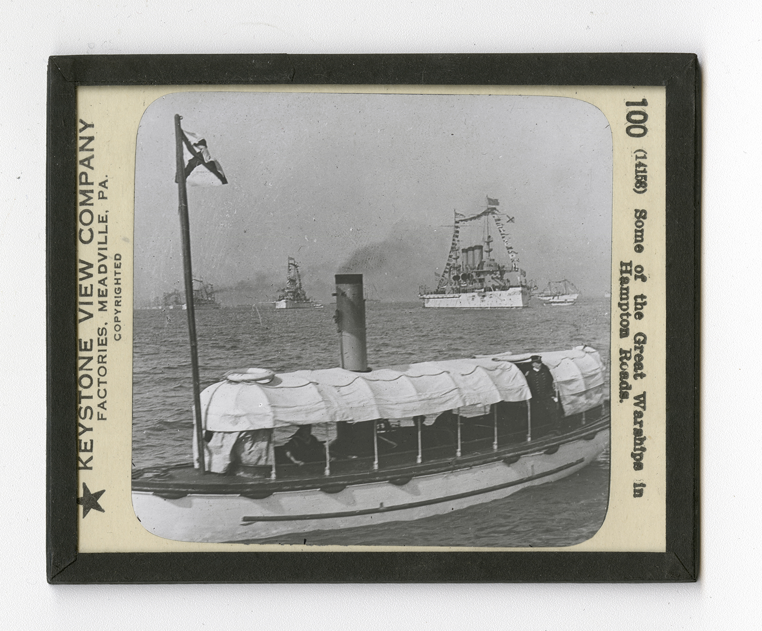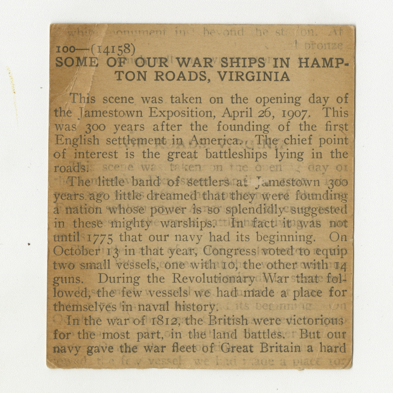 This scene was taken on the opening day of the Jamestown Exposition, April 26, 1907. This was 300 years after the founding of the first English settlement in America. The chief point of interest is the great battleships lying in the roads. The little band of settlers at Jamestown 300 years ago little dreamed that they were founding a nation whose power is so splendidly suggested in these mighty warships. In fact it was not until 1775 that our navy had its beginning. On October 13 in that year, Congress voted to equip two small vessels, one with 10, the other with 14 guns. During the Revolutionary War that followed, the few vessels we had made a place for themselves in naval history. In the war of 1812, the British were victorious for the most part, in the land battles. But our navy gave the war fleet of Great Britain a hard