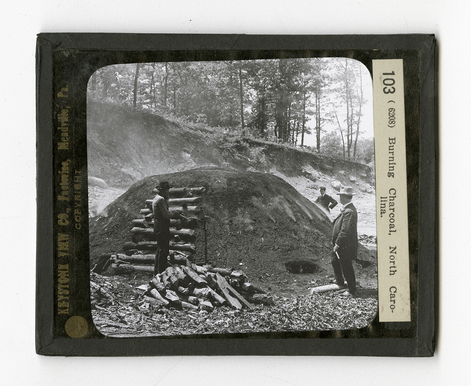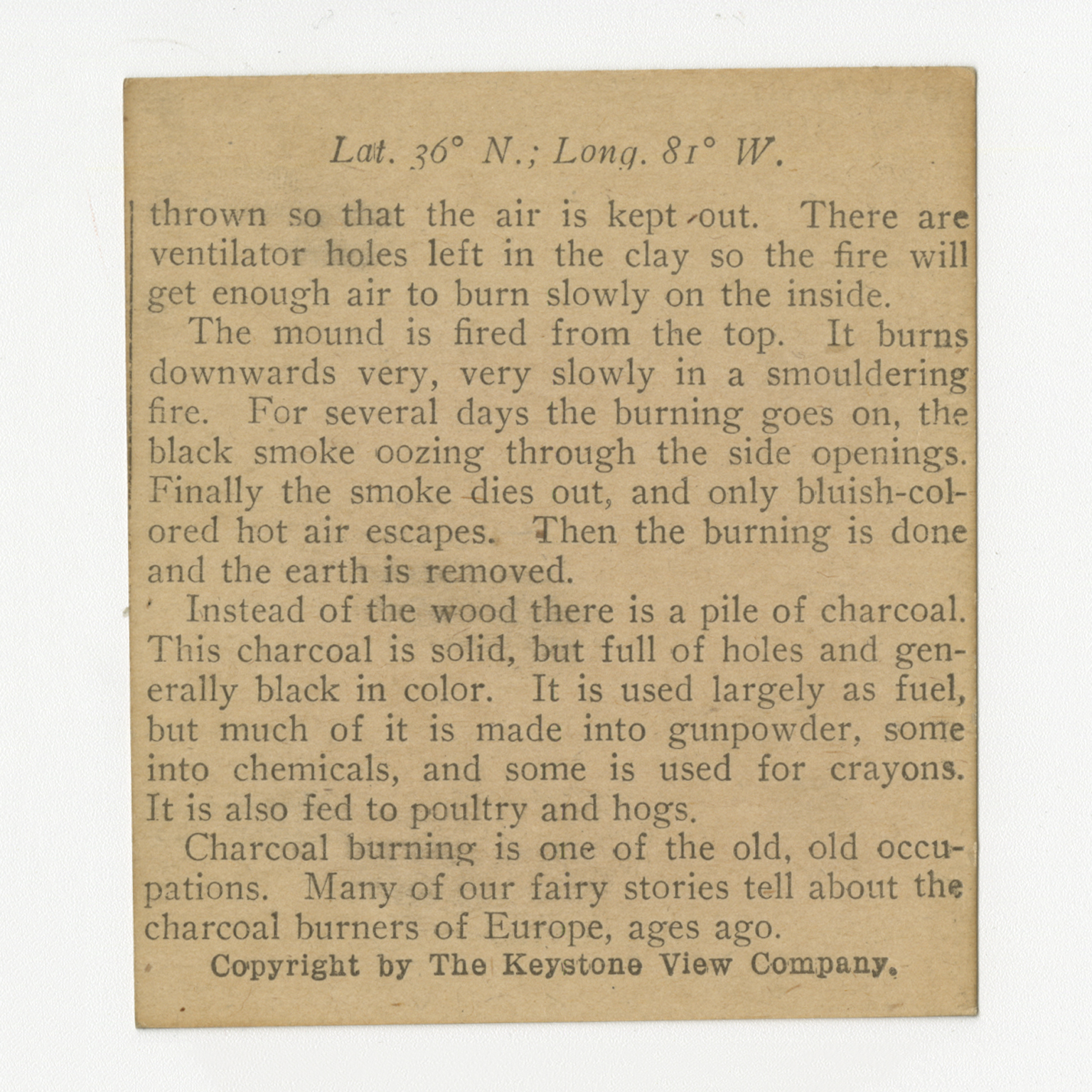 The Western counties of North Carolina are crossed by the Appalachian Mountains. Much of the country is very rough and the land is too poor to be farmed with any profit. But the hillsides are well wooded and timber is the chief source of wealth. This region is spoken of as the "Sapphire Country". This is a charcoal oven or mound. In it wood is being made into charcoal by burning. The mound itself looks like a huge molehill. If you could have a view of the inside of this mound you would see tiers of wood set on end, one tier on top of the other. There are usually 3 tiers so placed, making the pile about 12 feet high. The mounds are of various sizes. Some are only 10 feet in diameter, others are so much as 50 feet. The wood is staked so the tops of the sticks lean towards the center, forming a cone. Over the wood are piled leaves, grass, and straw, and on top of these several inches of dirt are