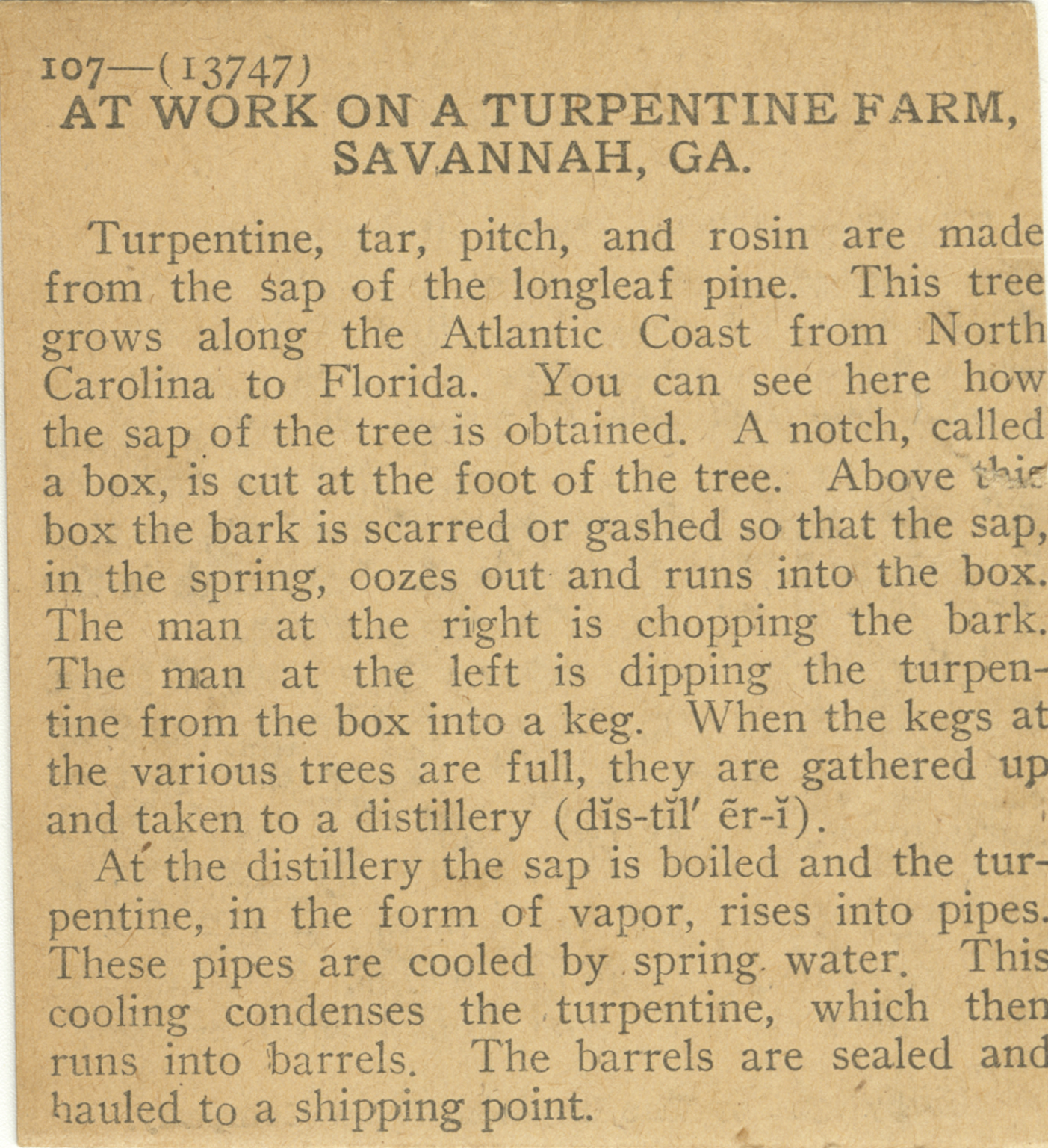 Turpentine, tar, pitch, and rosin are made from sap of the longleaf pine. This tree grows along the Atlantic Coast from North Carolina to Florida. You can see here how the sap of the tree is obtained. A notch, called a box, is cut at the foot of the tree. Above this box the bark is scarred or gashed so that the sap, in the spring, oozes out and runs into the box. The man at the right is chopping the bark. The man at the left is dipping the turpentine from the box into a keg. When the kegs at the various trees are full, they are gathered up and taken to a distillery. At the distillery the sap is boiled and the turpentine, in the form of vapor, rises into pipes. These pipes are cooled by spring water. This cooling condenses the turpentine, which then runs into barrels. The barrels are sealed and hauled to a shipping point.