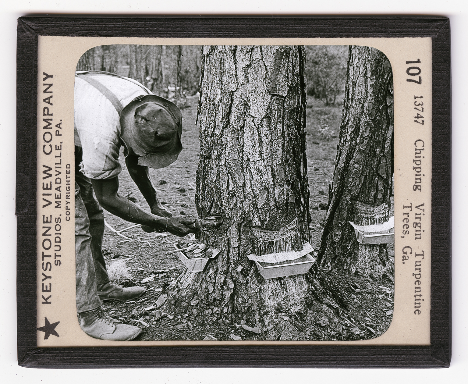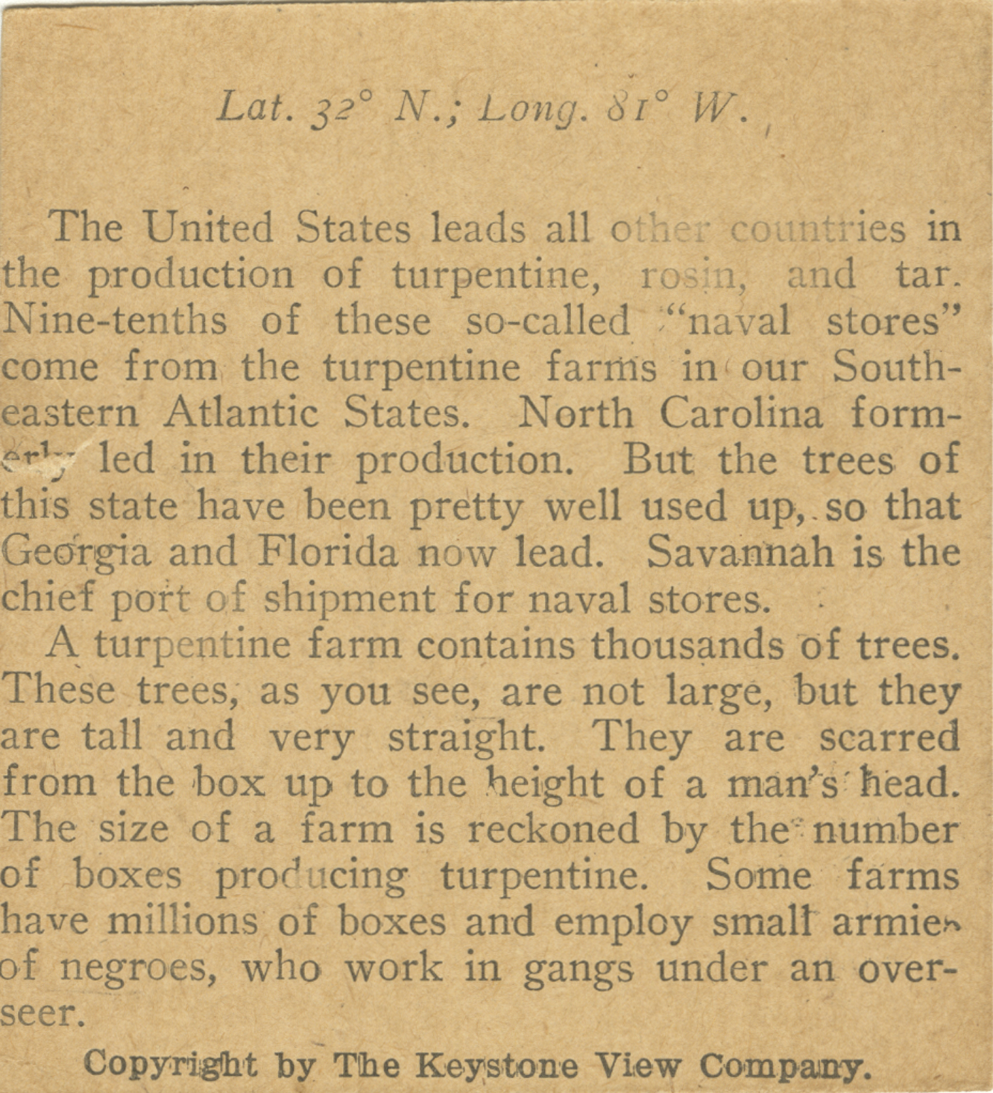 The United States leads all other countries in the production of turpentine, rosin, and tar. Nine-tenths of these so-called "naval stores" come from the turpentine farms in our Southeastern Atlantic States. North Carolina formerly led in their production. But the trees of this state have been pretty well used up, so that Georgia and Florida now lead. Savannah is the chief port of shipment for naval stores. A turpentine farm contains thousands of trees. These trees, as you see, are not large, but they are tall and very straight. They are scarred from the box up to the height of a man's head. The size of a farm is reckoned by the number of boxes producing turpentine. Some farms have millions of boxes and employ small armies of negroes, who work in gangs under an overseer.