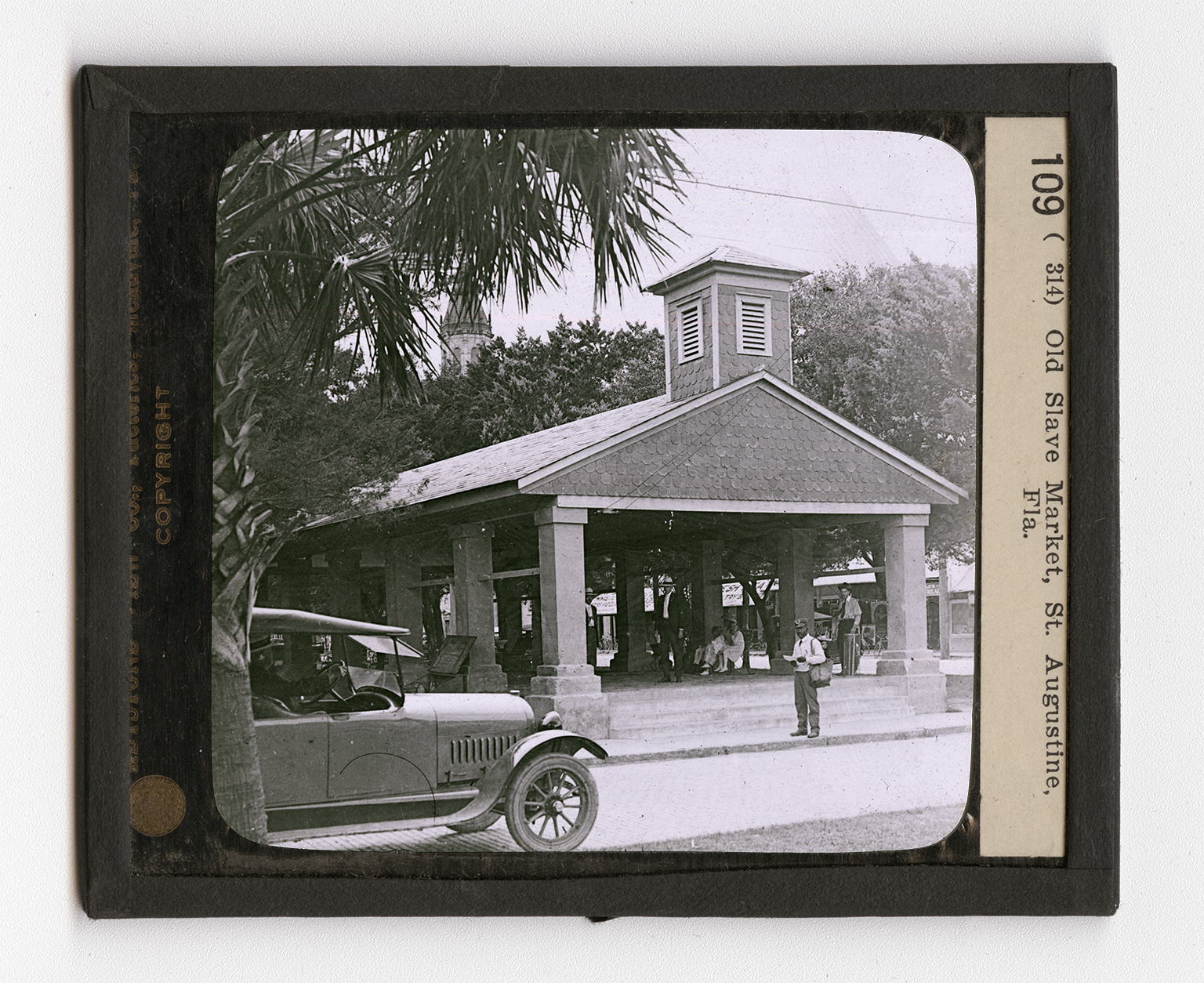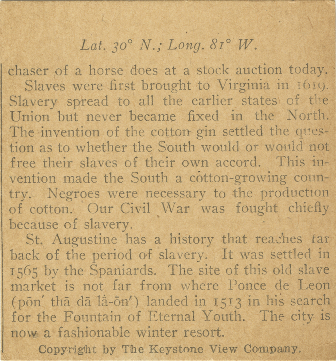 chaser of a horse does at a stock auction today. Slaves were first brought to Virginia in 1619. Slavery spread to all the earlier states of the Union but never became fixed in the North. The invention of the cotton gin settled the question as to whether the South would or would not free their slaves of their own accord. This invention made the South a cotton-growing country. Negroes were necessary to the production of cotton. Our Civil War was fought chiefly because of slavery. St. Augustine has a history that reaches far back of the period of slavery. It was settled in 1565 by the Spaniards. The site of this old slave market is not far from where Ponce de Leon landed in 1513 in his search for the Fountain of Eternal Youth. The city is now a fashionable winter resort.
