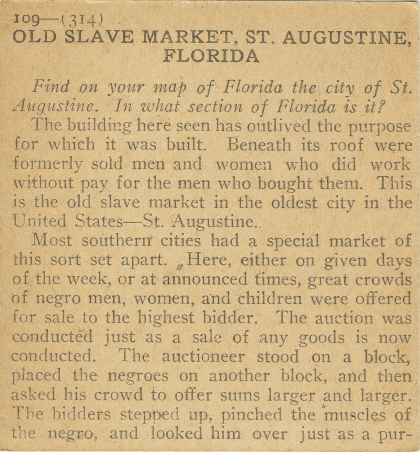Find on your map of Florida the city of St. Augustine. In what section of Florida is it? The building here seen has outlived the purpose for which it was built. Beneath its roof were formerly sold men and women who did work without pay for the men who bought them. This is the old slave market in the oldest city in the United States--St. Augustine. Most southern cities had a special market of this sort set apart. Here, either on given days of the week, or at announced times, great crowds of negro men, women, and children were offered for sale to the highest bidder. The auction was conducted just as a sale of any goods is now conducted. The auctioneer stood on a block, placed the negroes on another block, and then asked his crowd to offer sums larger and larger. The bidders stepped up, pinched the muscles of the negro, and looked him over just as a pur-