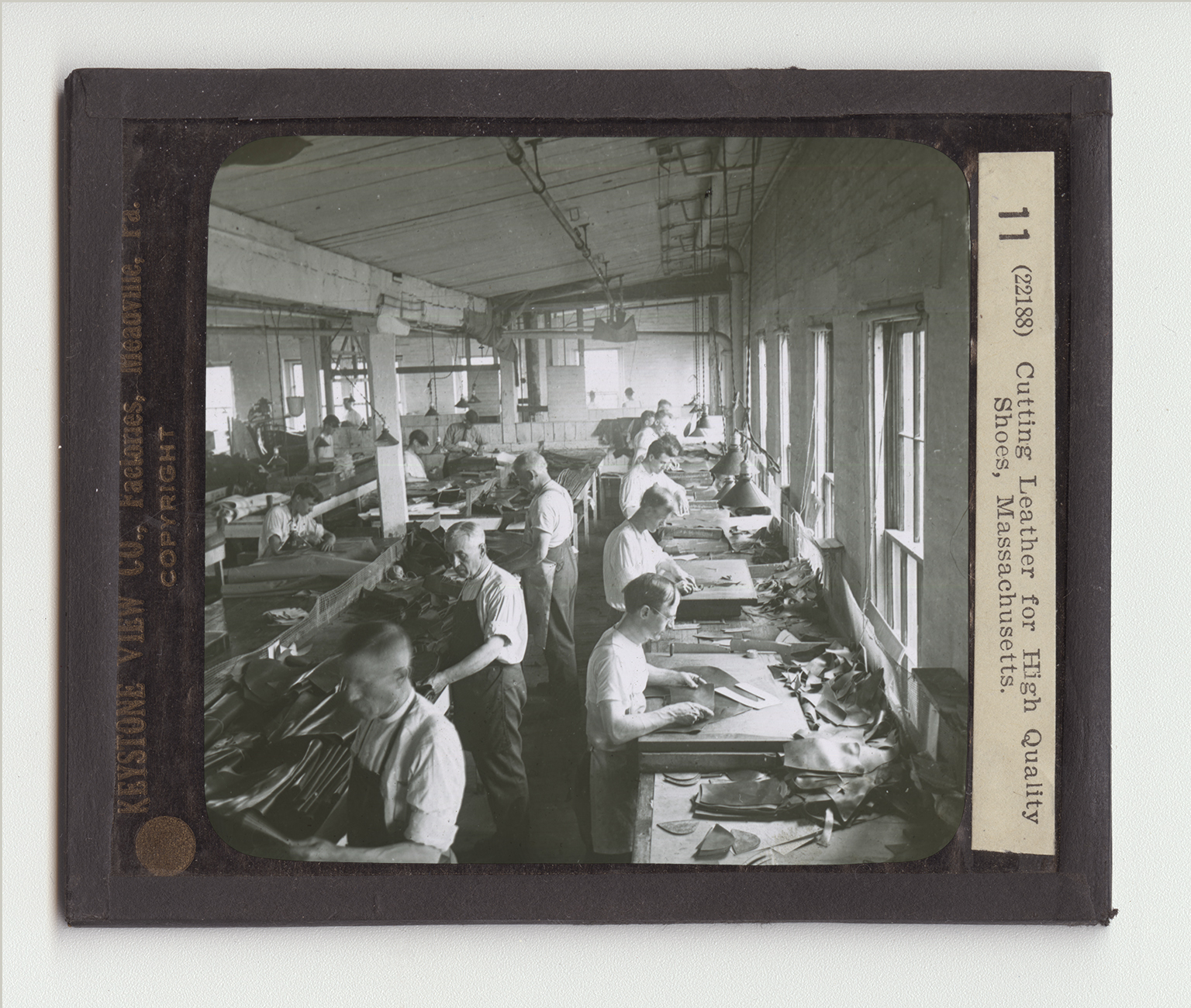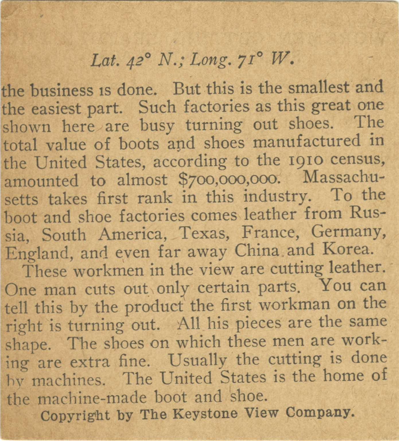 the business is done. But this is the smallest and the easiest part. Such factories as this great one shown here are busy turning out shoes. The total value of boots and shoes manufactured in the United States, according to the 1910 census, amounted to almost $700,000,000. Massachusetts takes first rank in this industry. To the boot and shoe factories comes leather from Russia, South America, Texas, France, Germany, England, and even far away China and Korea. These workmen in the view are cutting leather. One man cuts out only certain parts. You can tell this by the product the first workman on the right is turning out. All his pieces are the same shape. The shoes on which these men are working are extra fine. Usually the cutting is done by machines. The United States is the home of the machine-made boot and shoe.