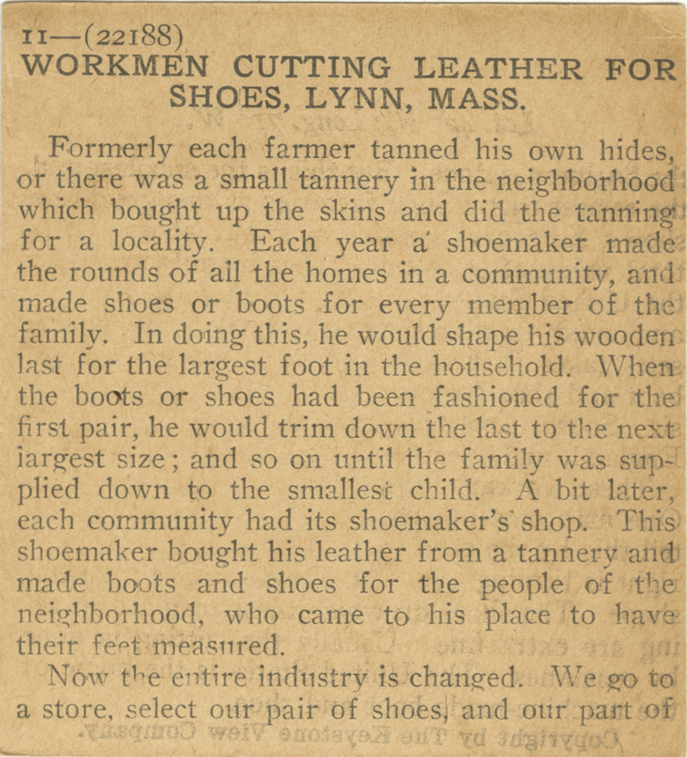 Formerly each farmer tanned his own hides, or there was a small tannery in the neighborhood which bought up the skins and did the tanning for a locality. Each year a shoemaker made the rounds of all the homes in a community, and made shoes or boots for every member of the family. In doing this, he would shape in his wooden last for the largest foot in the household. When the boots or shoes had been fashioned for the first pair, he would trim down the last to the next largest size; and so on until the family was supplied down to the smallest child. A bit later, each community had its shoemaker's shop. This shoemaker bought his leather from a tannery and made boots and shoes for the people of the neighborhood, who came to his place to have their feet measured. Now the entire industry is changed. We go to a store, select our pair of shoes, and our part of