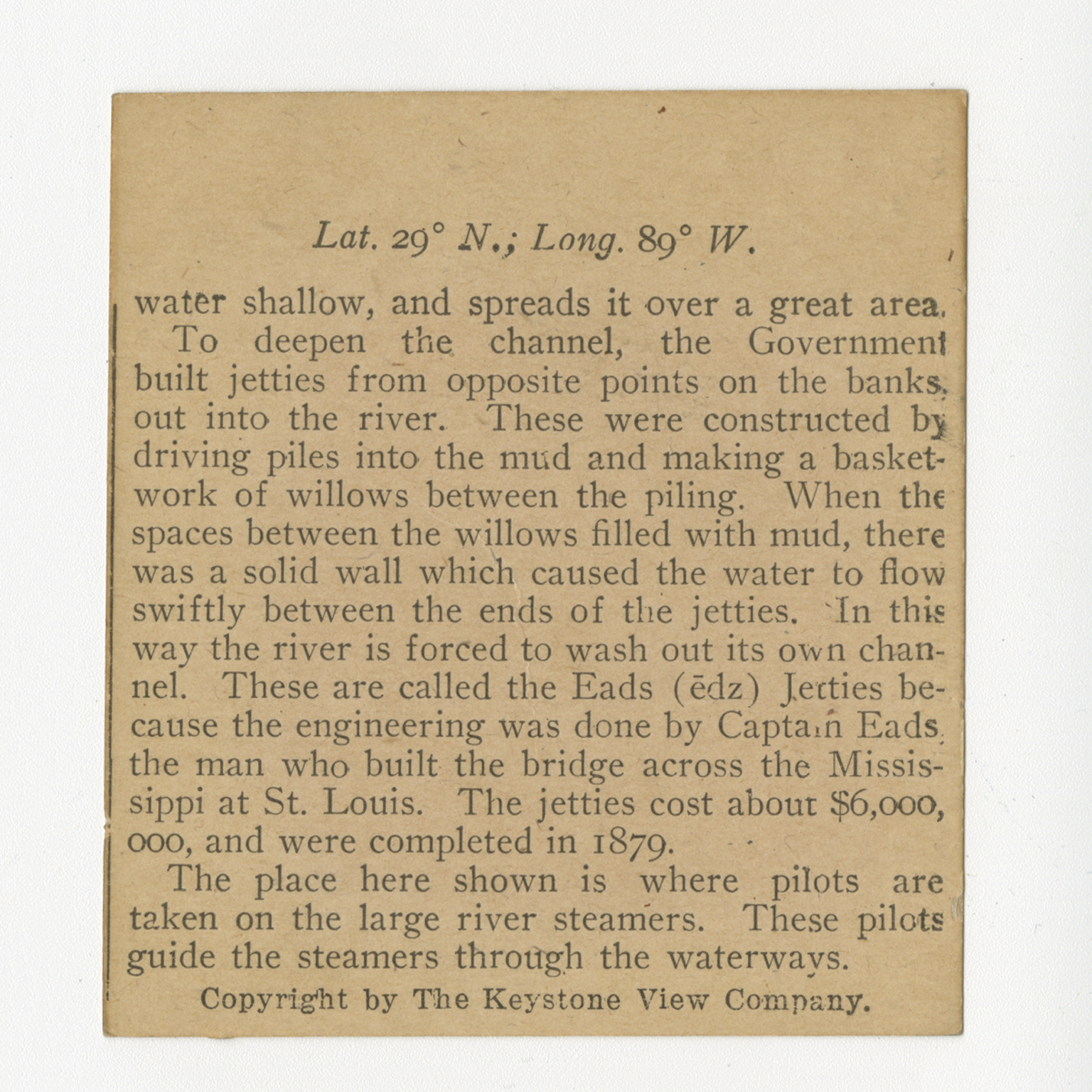 water shallow, and spreads it over a great area. To deepen the channel, the Government built jetties from opposite points on the banks out into the river. These were constructed by driving piles into the mud and making a basketwork of willows between the piling. When the spaces between the willows filled with mud, there was a solid wall which caused the water to flow swiftly between the ends of the jetties. In this way the river is forced to wash out its own channel. These are called the Eads Jetties because the engineering was done by Captain Eads, the man who built the bridge across the Mississippi at St. Louis. The jetties cost about $6,000,000, and were completed in 1879. The place here shown is where pilots are taken on the large river steamers. These pilots guide the steamers through the waterways.