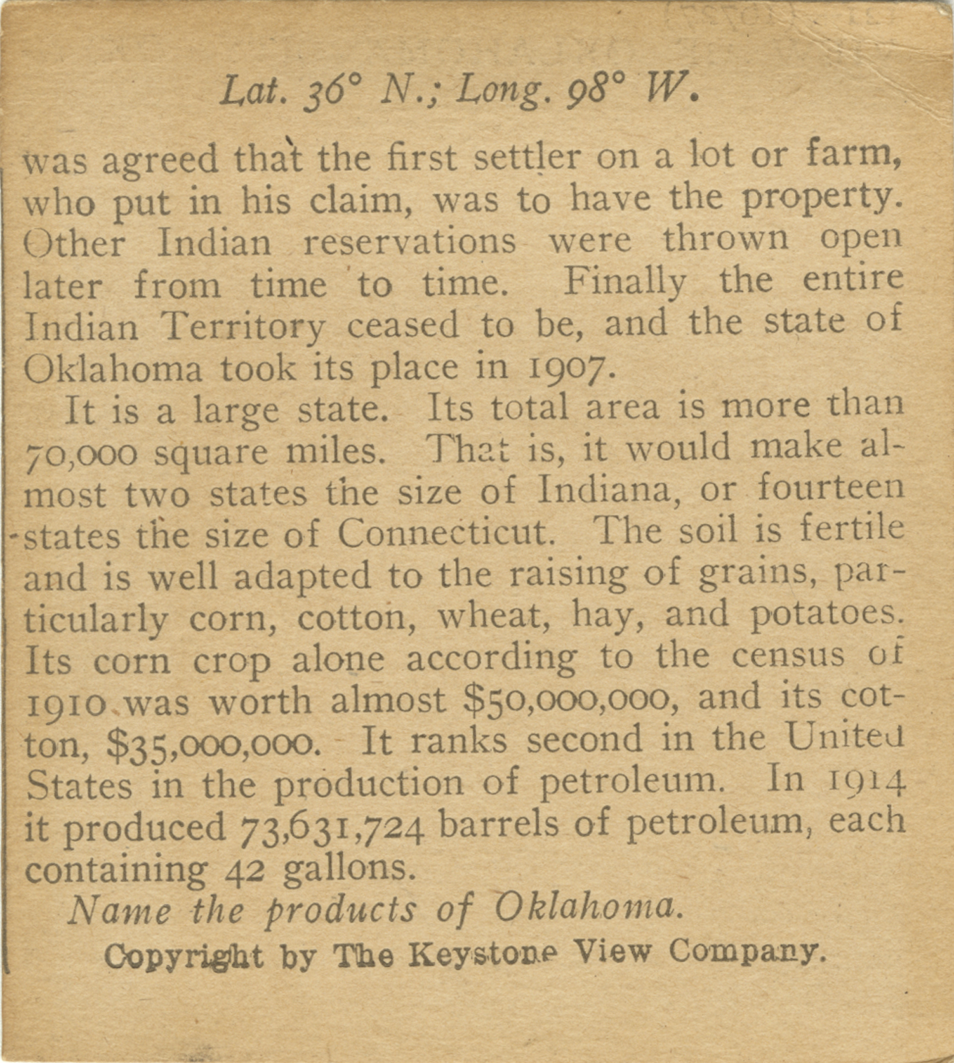 was agreed that the first settler on a lot or farm, who put in his claim, was to have the property. Other Indian reservations were thrown open later from time to time. Finally the entire Indian Territory ceased to be, and the state of Oklahoma took its place in 1907. It is a large state. Its total area is more than 70,000 square miles. That is, it would make almost two states the size of Indiana, or fourteen states the size of Connecticut. The soil is fertile and is well adapted to the raising of grains, particularly corn, cotton, wheat, hay, and potatoes. its corn crop alone according to the census of 1910 was worth almost $35,000,000. It ranks second in the United States in the production of petroleum. In 1914 it produced 73,631,724 barrels of petroleum, each contained 42 gallons. Name the products of Oklahoma.
