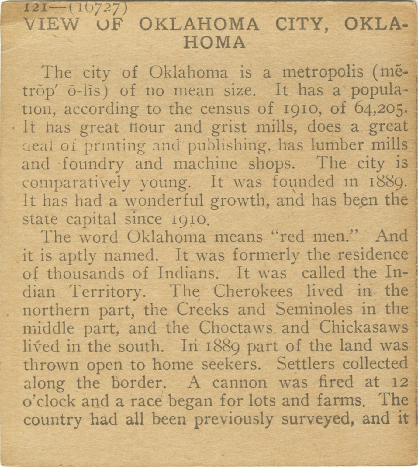 The city of Oklahoma is a metropolis of no mean size. it has a population, according to the census of 1910, of 64,205. It has great flour and grist mills, does a great deal of printing and publishing, has lumber mills and foundry and machine shops. The city is comparatively young. It was founded in 1889. It has had a wonderful growth, and has been the state capital since 1910. The world Oklahoma means "red men." And it is aptly named. It was formerly the residence of thousands of Indians. It was called the Indian Territory. The Cherokees lived in the northern part, the Creeks and Seminoles in the middle part, and the Choctaws and Chickasaws lived in the south. In the 1889 part of the land was thrown open to home seekers. Settlers collected along the border. A cannon was fired at 12 o'clock and a race began for lots and farms. The country had all been previously surveyed, and it