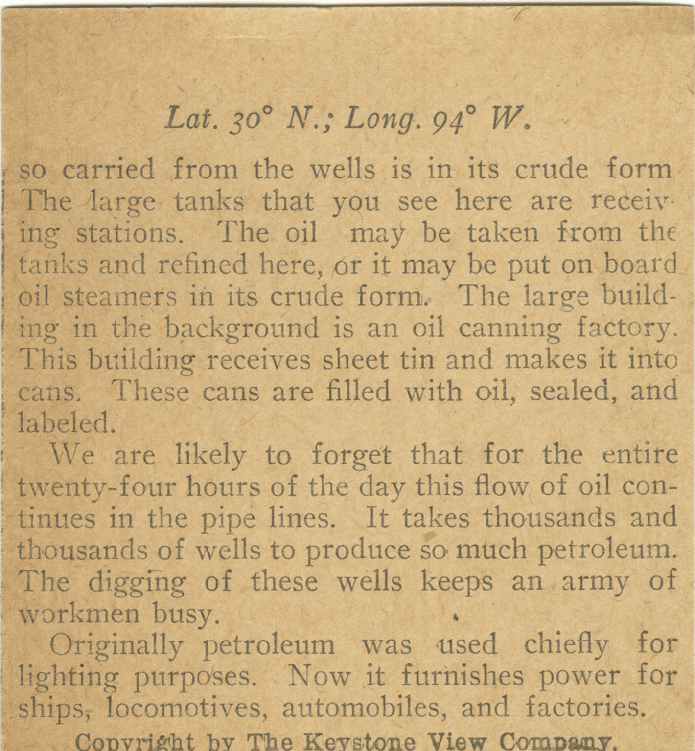 so carried from the wells is in its crude form. The large tanks that you see here are receiving stations. The oil may be taken from the tanks and refined here, or it may be put on board oil steamers in its crude form. The large building in the background is an oil canning factory. This building receives sheet tin and makes into cans. These cans are filled with oil, sealed, and labeled. We are likely to forget that for the entire twenty-four hours of the day this flow of oil continues in the pipe lines. It takes thousands and thousands of wells to produce so much petroleum. The digging of these wells keeps an army of workmen busy. Originally petroleum was used chiefly for lighting purposes. Now it furnished power for ships, locomotives, automobiles, and factories.