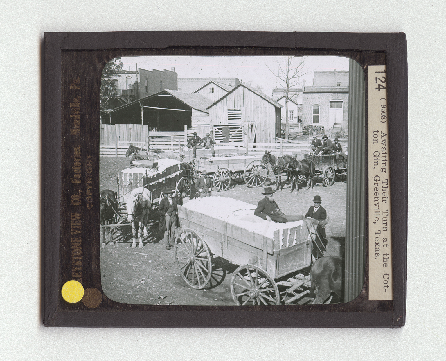 The man with the stiff hat is probably the purchaser for the gin. He examines the cotton takes particular note of its length of fiber, and tells each farmer how much he will pay per pound for his load. The wagon is then driven on scales and the weight noted. The cotton is unloaded and the wagon again driven on the scales. The weight of the wagon is subtracted from the weight previously found out. The difference leaves the number of pounds of cotton in the load. Texas easily leads all other Southern States in the production of this crop. It annually produces about 4,500,000 bales. What is the total value of this crop at 10c per pound? Name six or seven states in the Cotton Belt. Observe the dress of the men seen here. How do you account for their wearing wool hats in this warm climate?