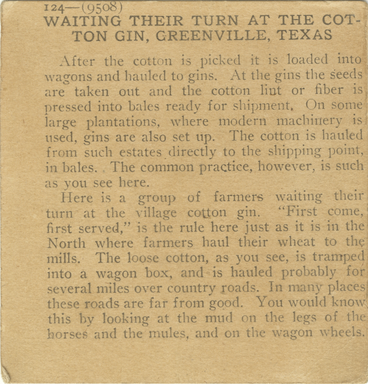 After the cotton is picked it is loaded into wagons and hauled to gins. At the gins the seeds are taken out and the cotton lint or fiber is pressed into bales ready for shipment. On some large plantations, where modern machinery is used, gins are also set up. The cotton is hauled from such estates directly to the shipping point, in bales. The common practice, however, is such as you see here. Here is a group of farmers waiting their turn at the village cotton gin. "First come, first served," is the rule here just as it is in the North where farmers haul their wheat to the mills. The loose cotton, as you see, is tramped into a wagon box, and is hauled probably for several miles over country roads. In many places these roads are far from good. You would know this by looking at the mud on the legs of the horses and the mules, and on the wagon wheels.