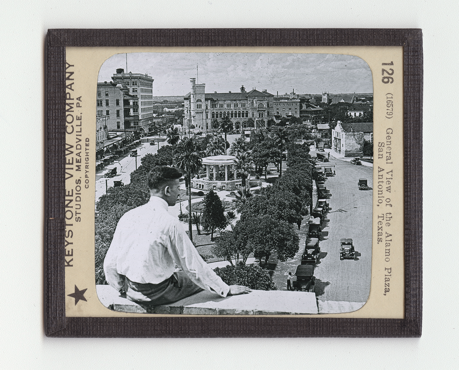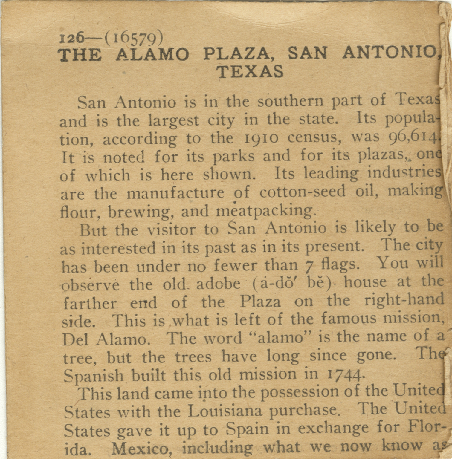San Antonio is in the southern part of Texas and is the largest city in the state. Its population, according to the 1910 census, was 96,914. It is noted for its parks and for its plazas, one of which is here shown. Its leading industries are the manufacture of cotton-seed oil, making flour, brewing, and meatpacking. But the visitor to San Antonio is likely to be as interested in its past as in its present. The city has been under no fewer than 7 flags. You will observe the old adobe (a-do be) house at the farther end of the Plaza on the right-hand side. This is what is left of the famous mission, Del Alamo. The world "alamo" is the name of a tree, but the trees have long since gone. The Spanish build this old mission in 1744. This land came into the possession of the United States with the Louisiana purchase. The United States gave it up to Spain in exchange for Florida. Mexico, including what we know as