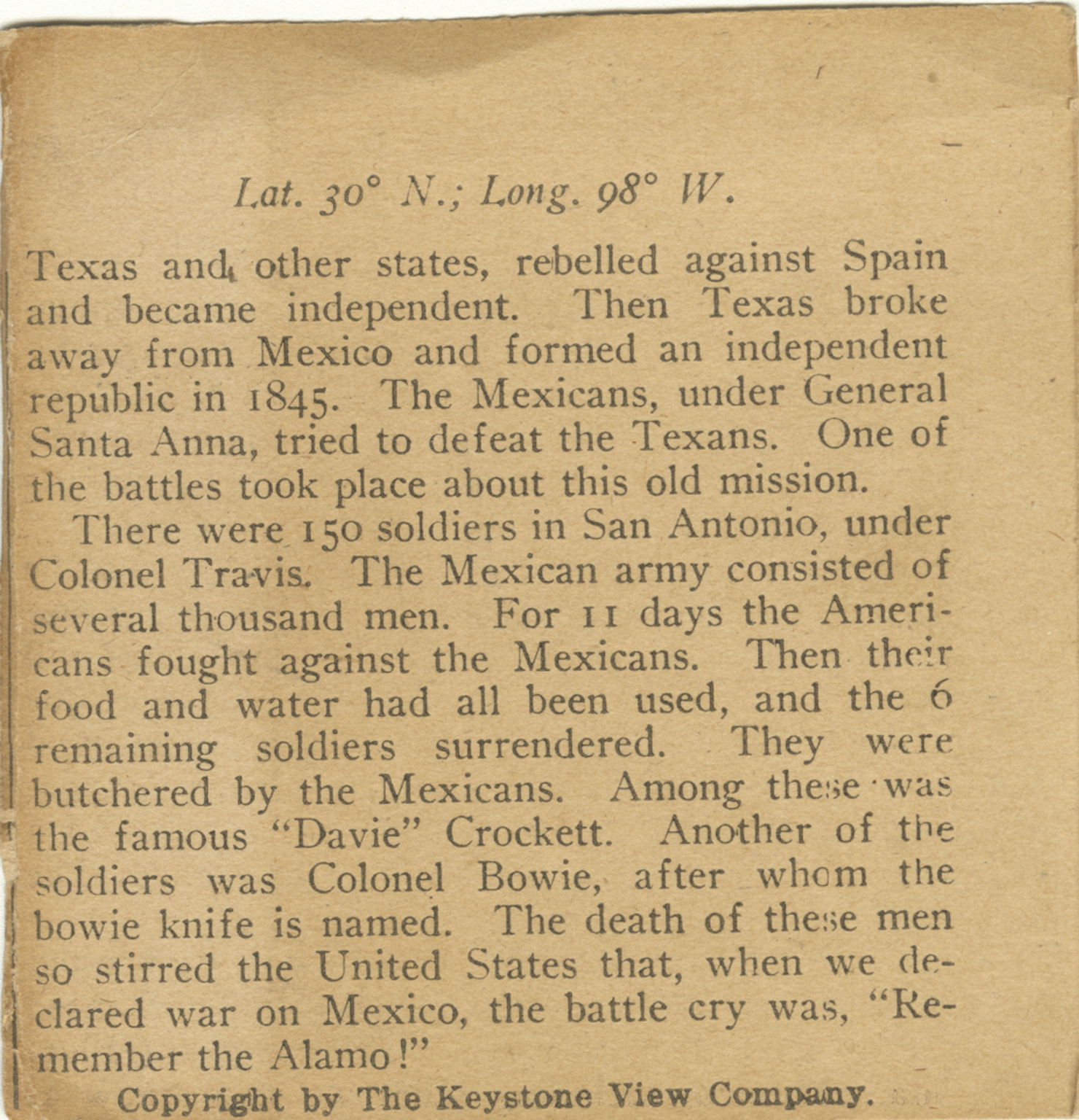 Texas and other states, rebelled against Spain and became independent. Then Texas broke away from Mexico and formed an independent republic in 1845. The Mexicans, under General Santa Anna, tried to defeat the Texans. One of the battles took place about this old mission. There were 150 soldiers in San Antonio, under Colonel Travis. The Mexican army consisted of several thousand men. For 11 days the Americans fought against the Mexicans. Then their food and water had all been used, and the 6 remaining soldiers surrendered. They were butchered by the Mexicans. Among these was the famous "Davie" Crockett. Another of the soldiers was Colonel Bowie, after whom the bowie knife is named. The death of these men so stirred the United States that, when we declared war on Mexico, the battle cry was, "Remember the Alamo!"