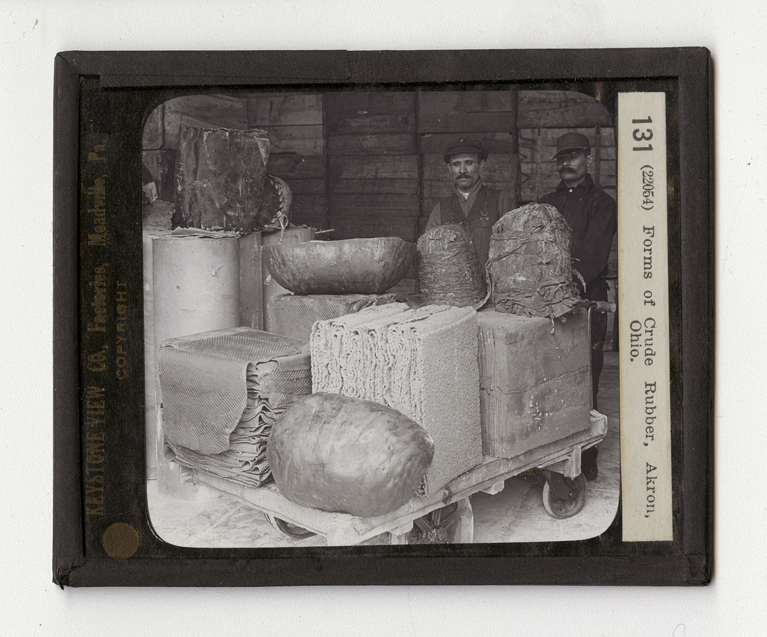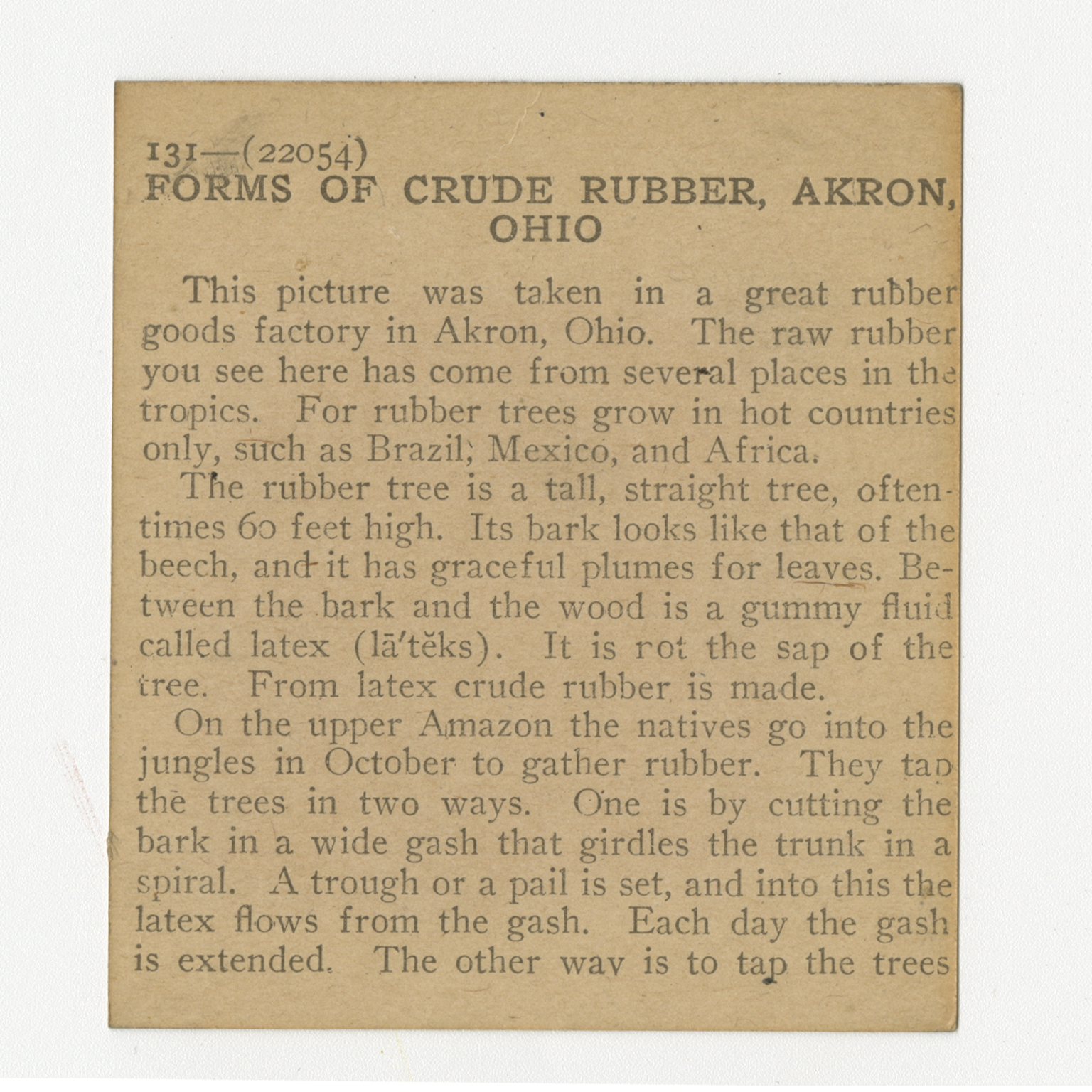 This picture was taken in a great rubber goods factory in Akron, Ohio. The raw rubber you see here has come from several places in the tropics. For rubber trees grow in hot countries only, such as Brazil, Mexico, and Africa. The rubber tree is a tall, straight tree, often times 60 feet high. Its bark looks like that of the beech, and it has graceful plumes for leaves. Between the bark and the wood is a gummy fluid called latex. It is not the sap of the tree. From latex crude rubber is made. On the upper Amazon the natives go into the jungles in October to gather rubber. They tap the trees in two ways. One is by cutting the bark in a wide gash that girdles the trunk in a spiral. A trough or a pail is set, and into this the latex flows from the gash. Each day the gash is extended. The other way is to tap the trees
