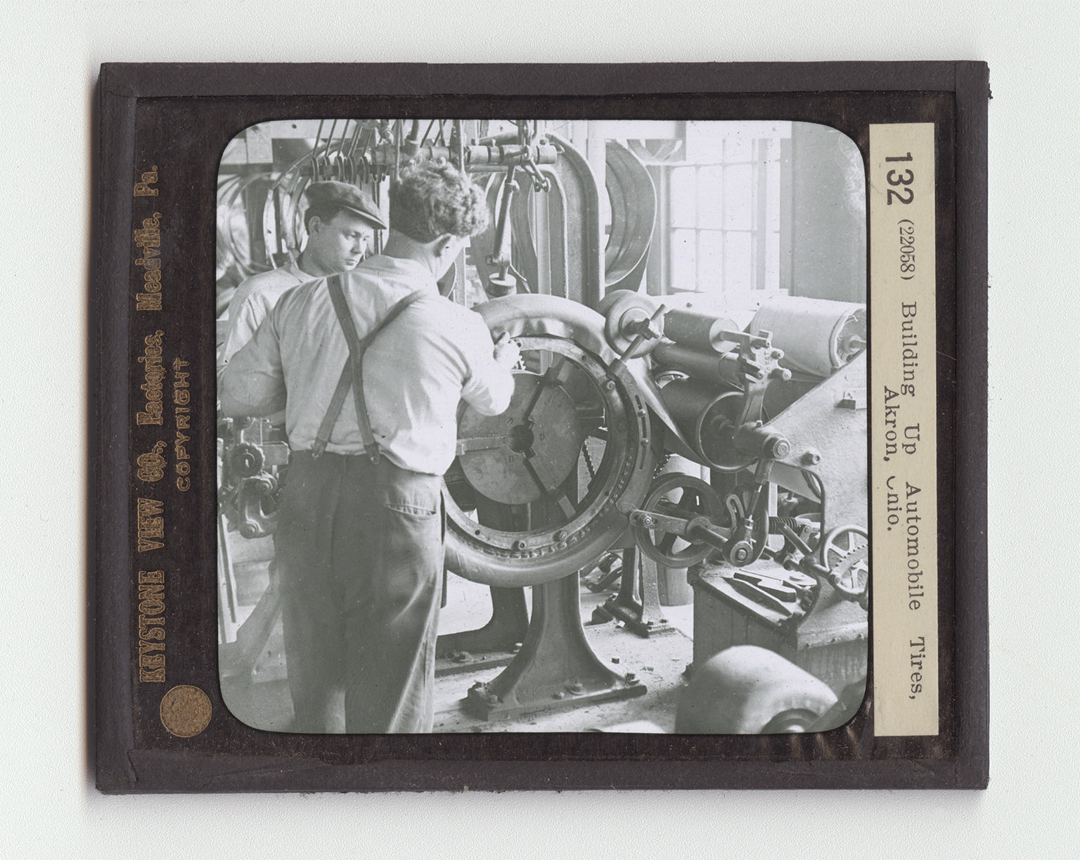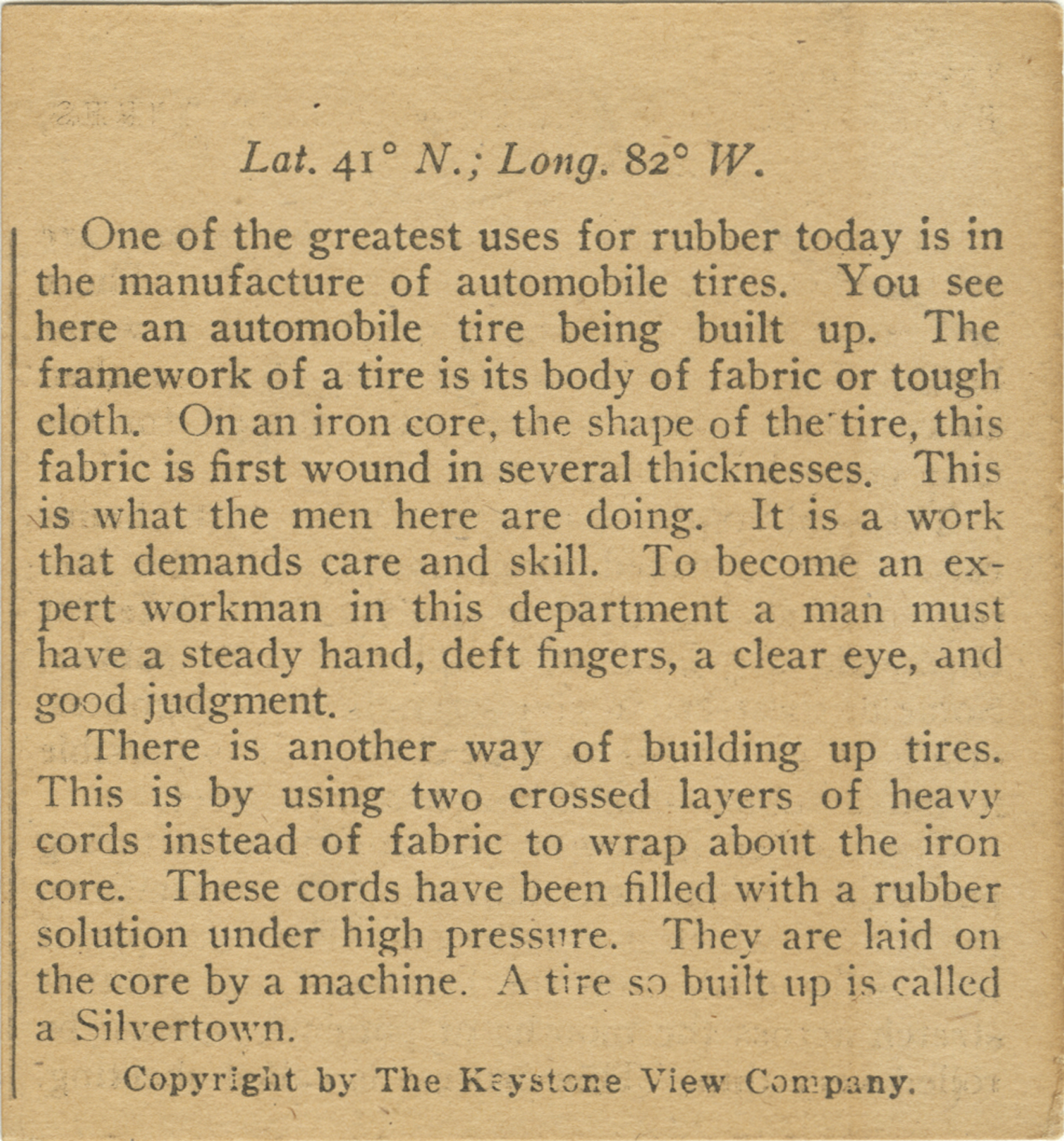 One of the greatest uses for rubber today is in the manufacture of automobile tires. You see here an automobile tire being built up. The framework of a tire is its body of fabric or tough cloth. On an iron core, the shape of the tire, this fabric is first wound in several thicknesses. This is what the men here are doing. It is a work that demands care and skill. To become an expert workman in this department a man must have a steady hand, deft fingers, a clear eye, and good judgment. There is another way of building up tires. This is by using two crossed layers of heavy cords instead of fabric to wrap about the iron core. These cords have been filled with a rubber solution under high pressure. They are laid on the core by a machine. A tire so built up is called a Silvertown.