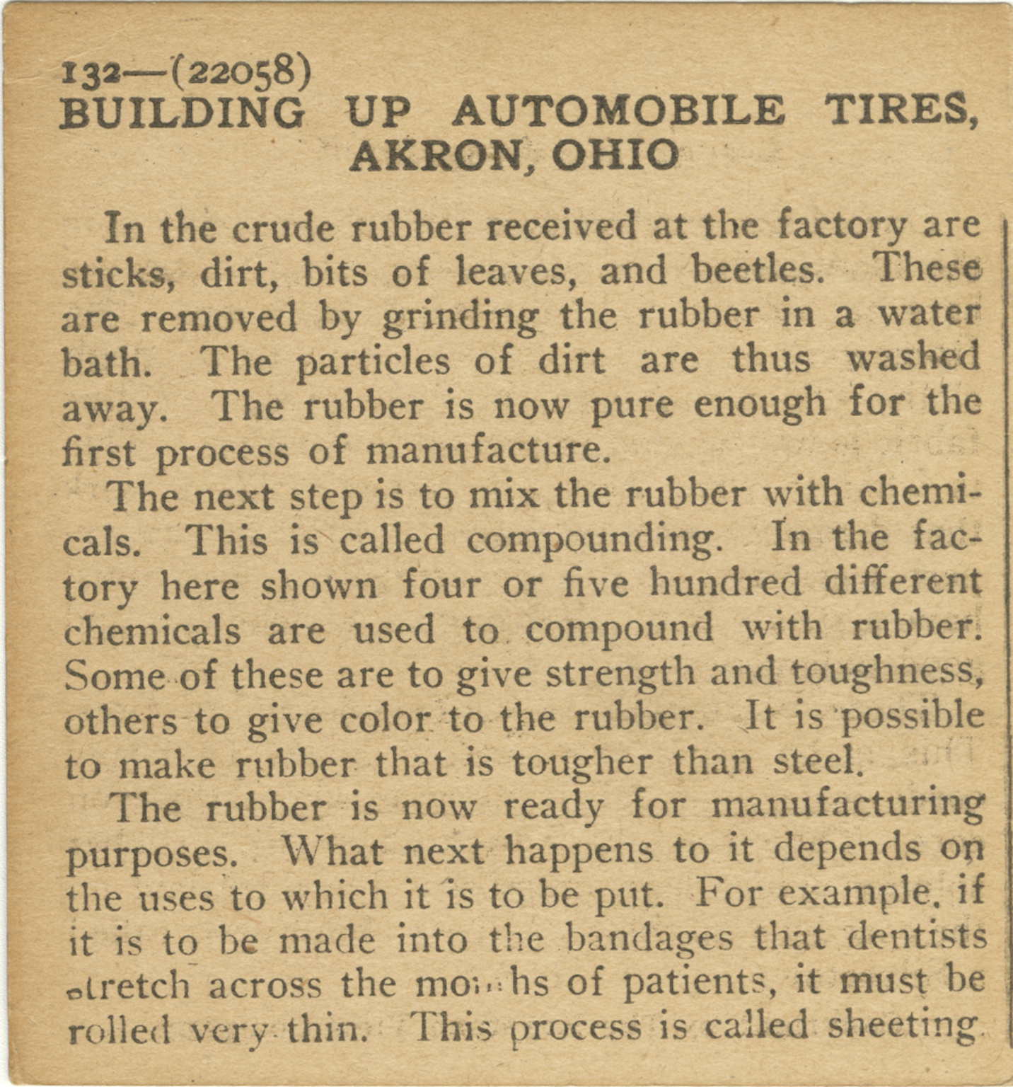In the crude rubber received at the factory are sticks, dirt, bits of leaves, and beetles. These are removed by grinding the rubber in a water bath. The particles of dirt are thus washed away. The rubber is now pure enough for the first process of manufacture. The next step is to mix the rubber with chemicals. This is called compounding. In the factory here shown four or five hundred chemicals are used to compound with rubber. Some of these are to given strength and toughness, others to give color to the rubber. It is possible to make rubber that is tougher than steel. The rubber is now ready for manufacturing purposes. What next happens to it depends on the uses to which it is to be put. For example, if it is to be made into the bandages that dentists stretch across the mouths of patients, it must be rolled very thin. This process is called sheeting.