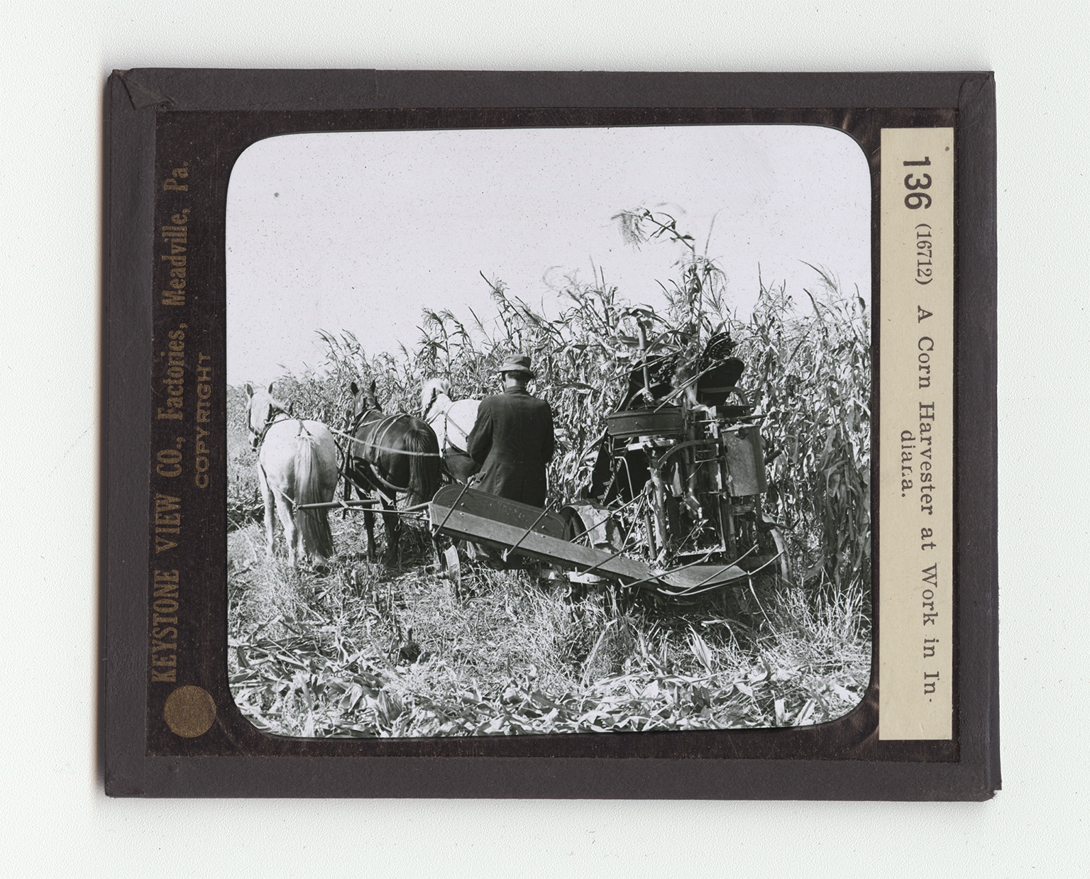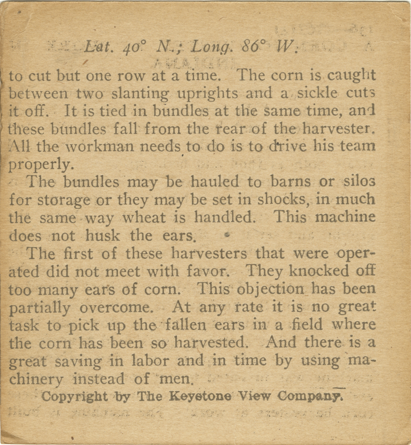 Corn is a double food supply for stock. The grain is one of the best foods known for horses, cattle, sheep, and hogs. And the stalks and leaves when cured take the place of hay and straw both as food and bedding. On many, perhaps most, small farms, corn is cut by hand. When it begins to ripen in September men cut it several inches above the ground and set it in shocks. It is then spoken of as corn fodder. On damp days during the fall or winter the shocks are torn apart, and the corn is husked. The fodder reshocked, and is hauled out of the field as it is needed for food. But corn cutting by hand is low and hard work. It takes a strong, quick field hand to cut 30 shocks, 12 hills square, in a day. Hence, a machine was invented to cut corn more rapidly and with less labor. You see here one of these corn harvesters at work. The machine is built