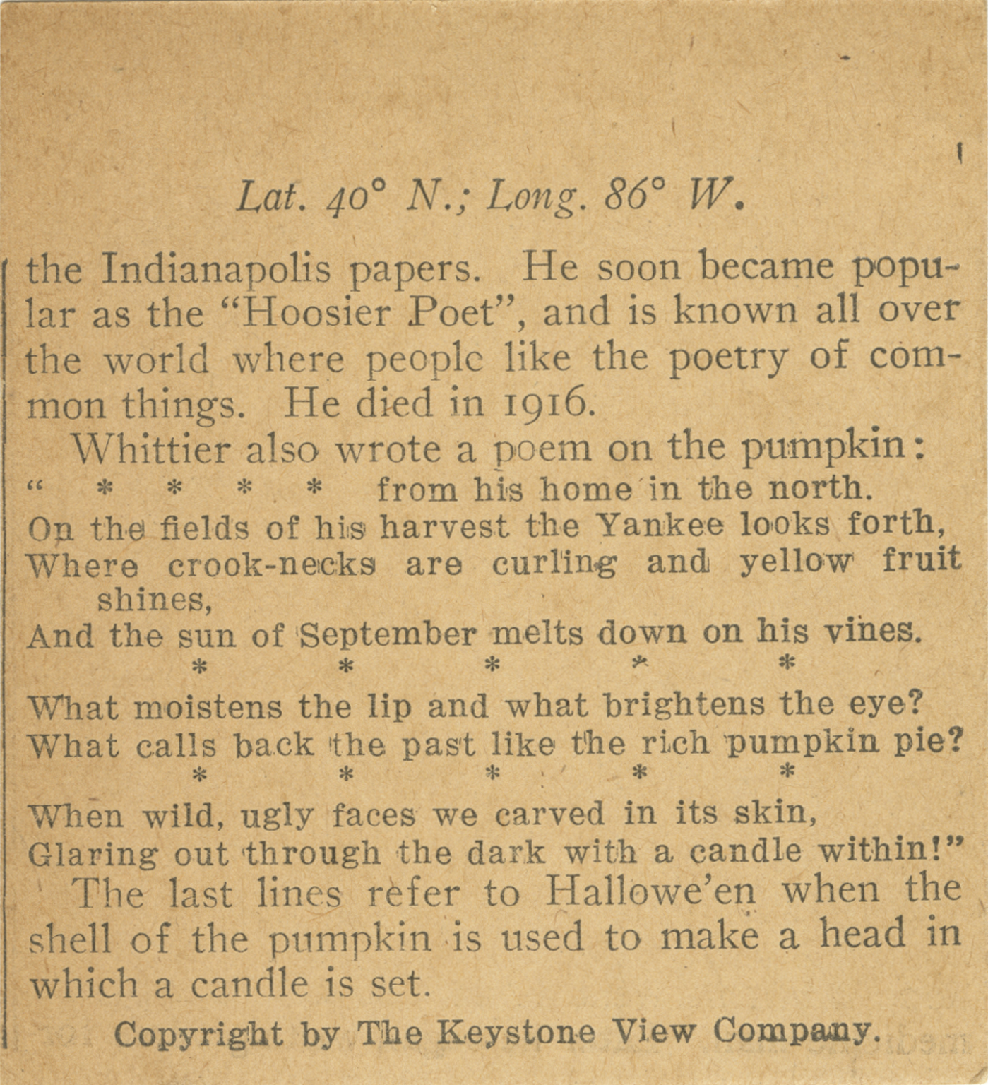 the Indianapolis papers. He soon became popular as the “Hoosier Poet”, and is known all over the world where people like the poetry of common things. He died in 1916. Whitter also wrote a poem on the pumpkin: “****from his home in the north. On the fields of his harvest the Yankee looks forth, Where crook-necks are curling and yellow fruit shines, And the sun of September melts down on his vines. ***** What moistens the lip and what brightens the eye? What calls back the past like the rich pumpkin pie? ***** When wild, ugly faces we carved in its skin, Glaring out through the dark with a candle within!” The last lines refer to Hallowe’en when the shell of the pumpkin is used to make a head in which a candle is set.