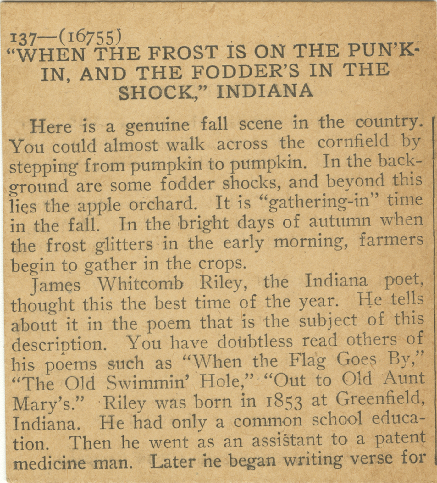 Here is a genuine fall scene in the country. You could almost walk across the cornfield by stepping from pumpkin to pumpkin. In the background are some fodder shocks, and beyond this lies the apple orchard. It is ‘gathering-in” time in the fall. In the bright days of autumn when the frost glitters in the early morning, farmers begin to gather in the crops. James Whitcomb Riley, the Indiana poet, thought this the best time of the year. He tells about it in the poem that is the subject of this description. You have doubtless read others of his poems such as “When the Flag Goes By,” “The Old Swimmin’ Hole,” “Out to Old Aunt Mary’s.” Riley was born in 1853 at Greenfield, Indiana. He had only a common school education. Then he went as an assistant to a patent medicine man. Later he began writing verse for
