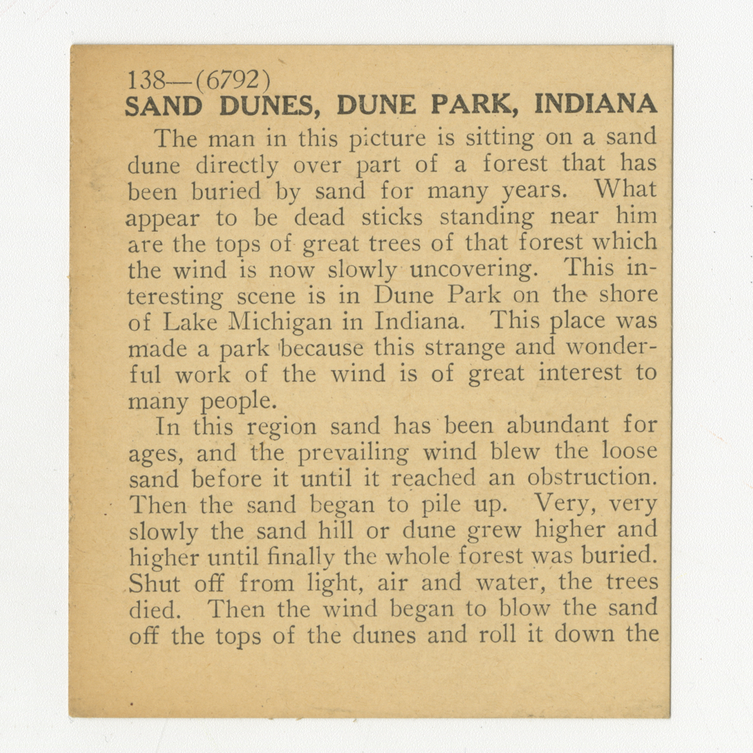 The man in this picture is sitting on a sand dune directly over part of a forest that has been buried by sand for many years. What appear to be dead sticks standing near him are the tops of great trees of that forest which the wind is now slowly uncovering. This interesting scene is in Dune Park on the shore of Lake Michigan in Indiana. this place was made a park because this strange and wonderful work of the wind is of great interest to many people. In this region sand has been abundant for ages, and the prevailing wind blew the loose sand before it until it reached an obstruction. Then the sand began to pile up. Very, very slowly the sand hill or dune grew higher and higher until finally the whole forest was buried. Shut off from light, air and water, the trees dried. Then the wind began to blow the sand off the tops of the dunes and roll it down the