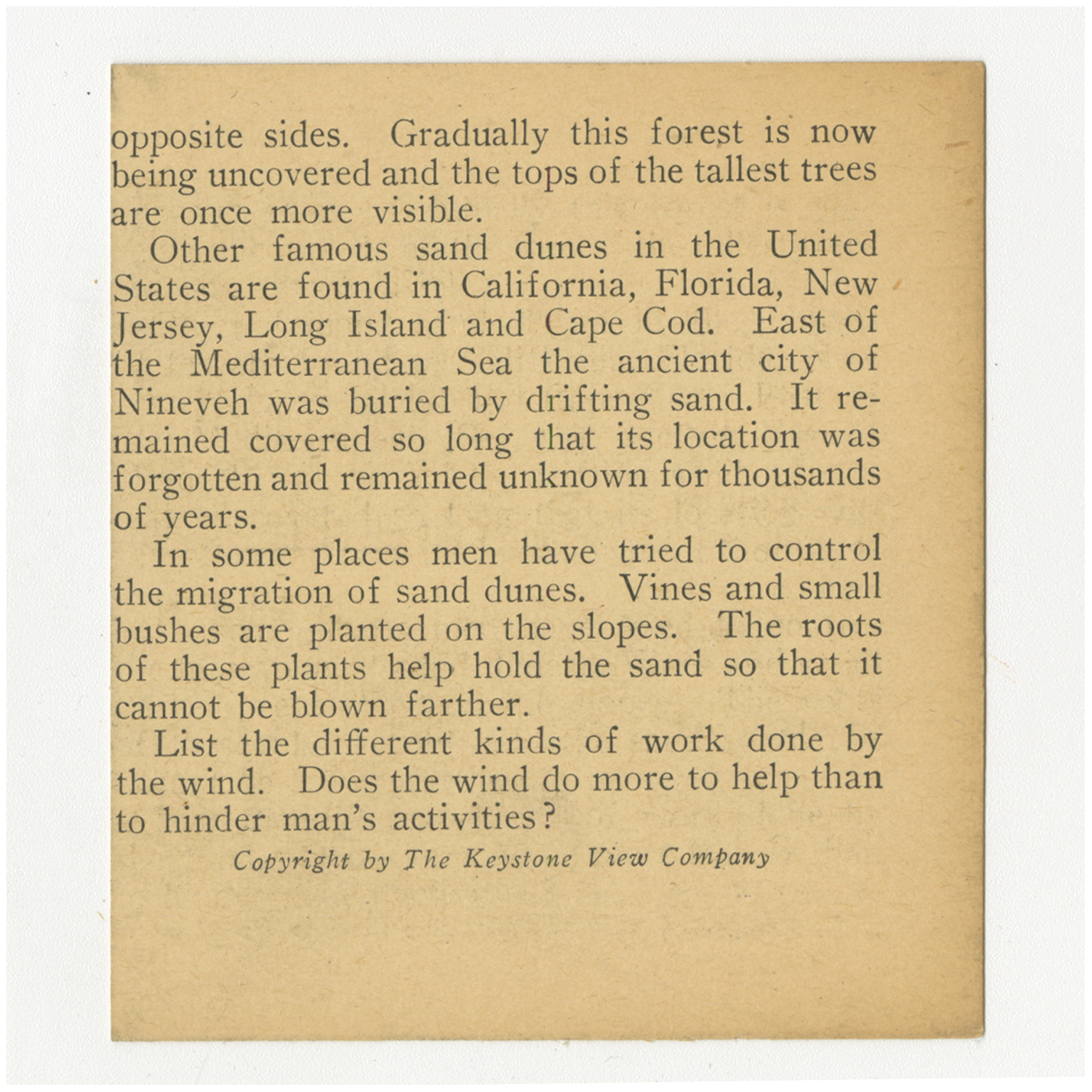 opposite sides. Gradually this forest is now being uncovered and the tops of tallest trees are once more visible. Other famous sand dunes in the United States are found in California, Florida, New Jersey, Long Island and Cape Cod. East of the Mediterranean Sea the ancient city of Nineveh was buried by drifting sand. It remained covered so long that its location was forgotten and remained unknown for thousands of years. In some places men have tried to control the migration of sand dunes. Vines and small bushed are planted on the slopes. The roots of these plants help hold the sand so that it cannot be blown farther. List the different kinds of work done by the wind. Does the wind do more to help than to hinder man’s activities.