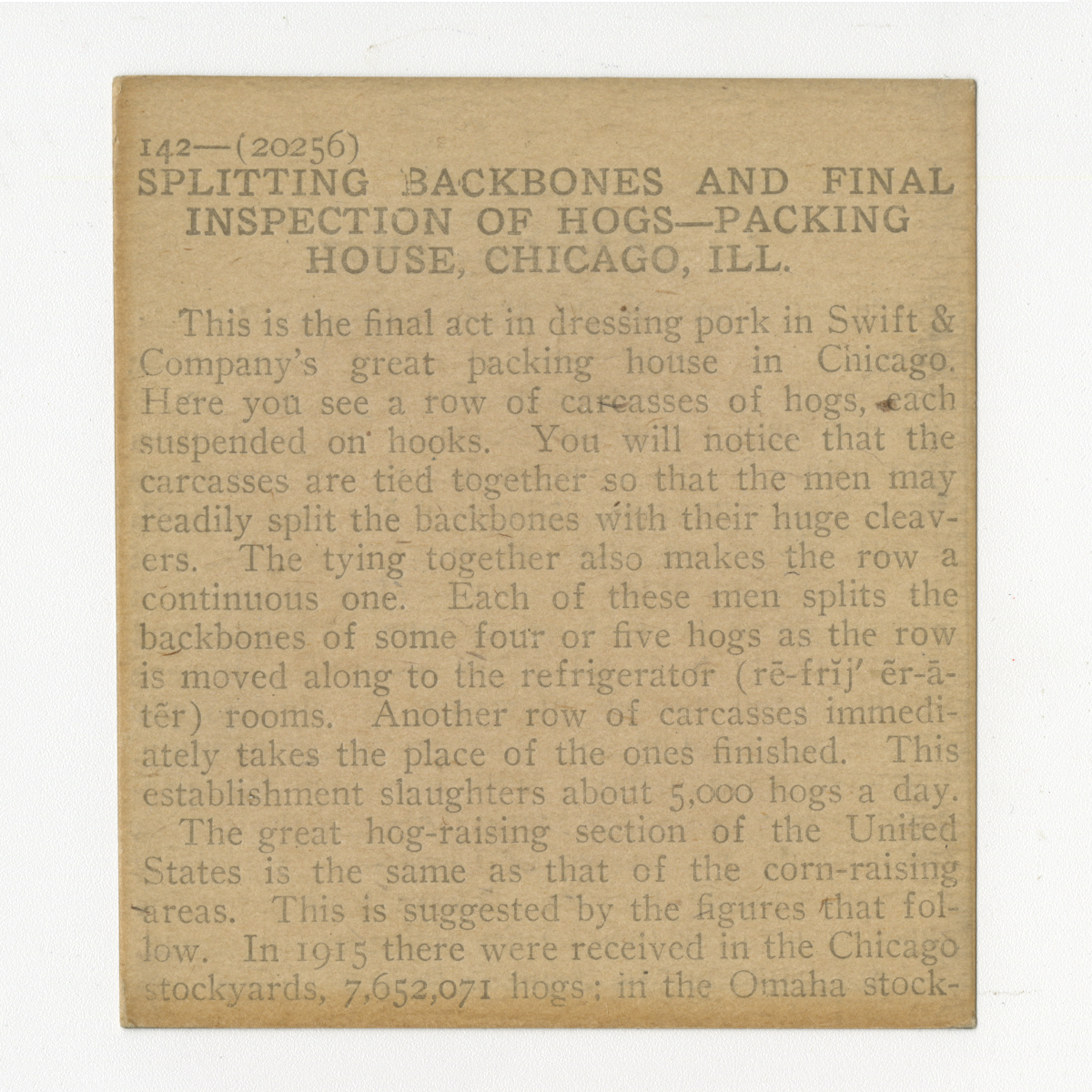 This is the final act in dressing pork in Swift & Company’s great packing house in Chicago. Here you see a row of carcasses of hogs, each suspended on hooks. You will notice that the carcasses are tied together so that the men may readily split the backbones with their huge cleavers. The tying together also makes the row a continuous one. Each of these men splits the backbones of some four or five hogs as the row is moved along the refrigerator rooms. Another row of carcasses immediately takes the place of the ones finished. This establishment slaughters about 5,000 hogs a day. The great hog-raising section of the United States is the same as that of the corn-raising areas. This is suggested by the figures that follow. In 1915 there were received in the Chicago stockyards, 7,652,071 hogs; in the Omaha stock-