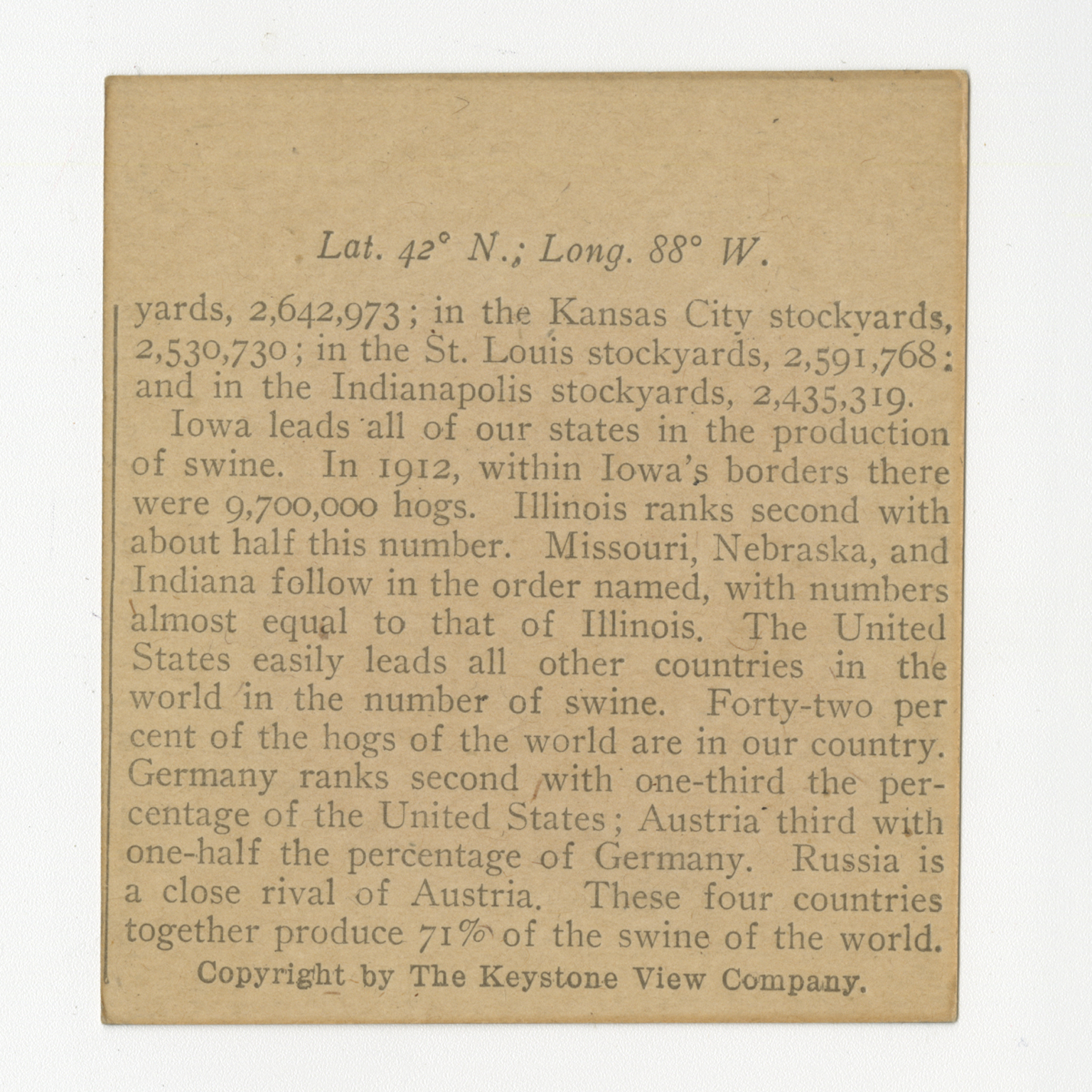 yards, 2,642,973; in the Kansas City stockyards, 2,530,730; in the St. Louis stockyards, 2,591,768; and in the Indianapolis stockyards, 2,435,319. Iowa leads all our states in the production of swine. In 1912, within Iowa’s borders there were 9,700,000 hogs. Illinois ranks second with about half this number. Missouri, Nebraska, and Indiana follow in the order named, with numbers almost equal to that of Illinois. The United States easily leads all other countries in the world in the number of swine. Forty-two per cent of the hogs of the world are in our country. Germany ranks second with one-third the percentage of the United States; Austria third with one-half the percentage of Germany. Russia is a close rivcal of Austria. These four countries together produce 71% of the swine of the world.