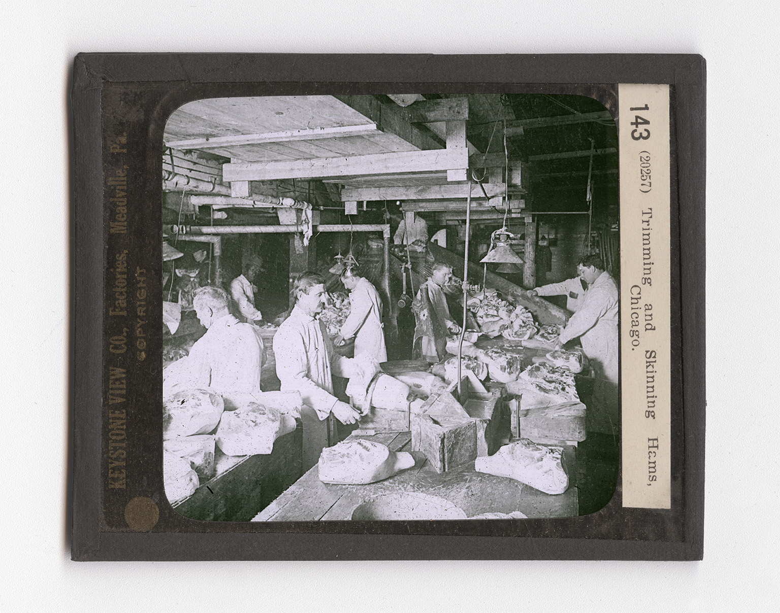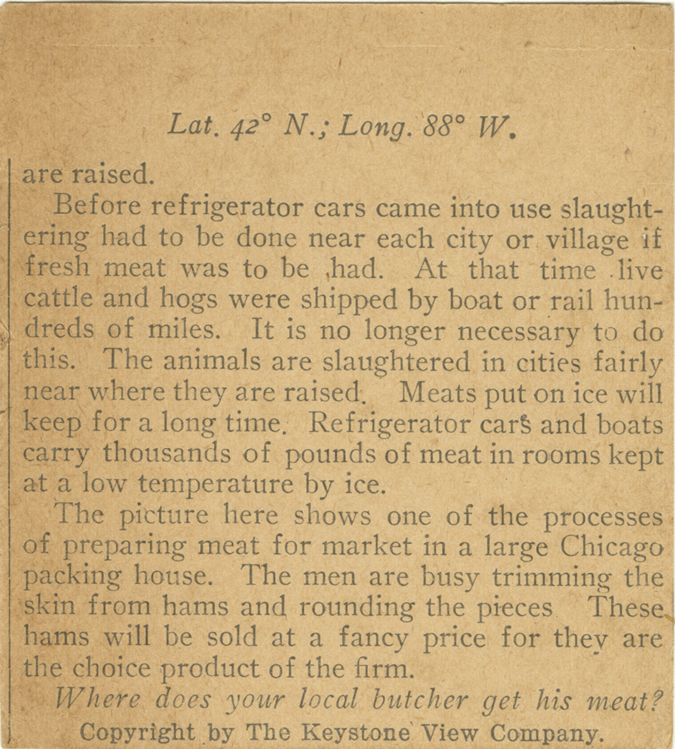 are raised. Before refrigerator cars came into use slaughtering had to be done near each city or village if fresh meat was to be had. At that time live cattle and hogs were shipped by baot or rail hundreds of miles. It is no longer necessary to do this. The animals are slaughtered in cities fairly near where they are raised. Meats out on ice will keep for a long time. Refrigerator cars and boats carry thousands of pounds of meat in rooms kept at a low temperature by ice. The picture here shows one of the processes of preparing meat for market in a large Chicago packing house. The men are busy trimming the skin from hams and rounding the pieces. These hams will be sold at a fancy price for they are the choice product of the firm. Where does your local butcher get his meat?