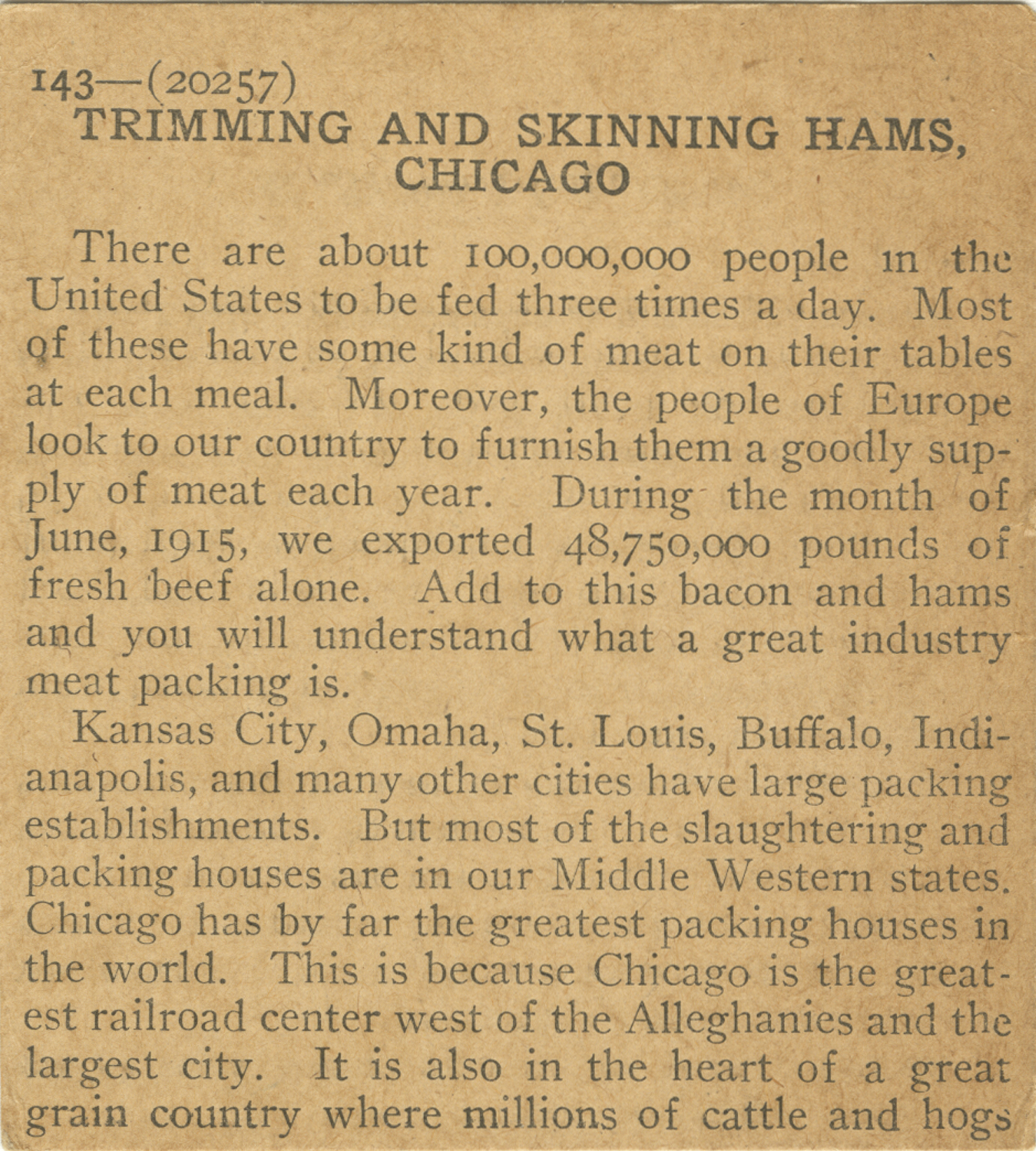 There are about 100,000,000 people in the United States to be fed three times a day. Most of these have some kind of meat on their tables at each meal. Moreover, the people of Europe look to our country to furnish them a goodly supply of meat each year. During the month of June, 1915, we exported 48,750,000 pounds of fresh beef alone. Add to this bacon and hams and you will understand what a great industry meat packing is. Kansas City, Omaha, St. Louis, Buffalo, Indianapolis, and many other cities have large packing establishments. But most of the slaughtering and packing houses are in our Middle Western states. Chicago has by far the greatest packing houses in the world. This is because Chicago is the greatest railroad center west of the Alleghanies and the largest city. It is also in the heart of a great grain country where millions of cattle and hogs