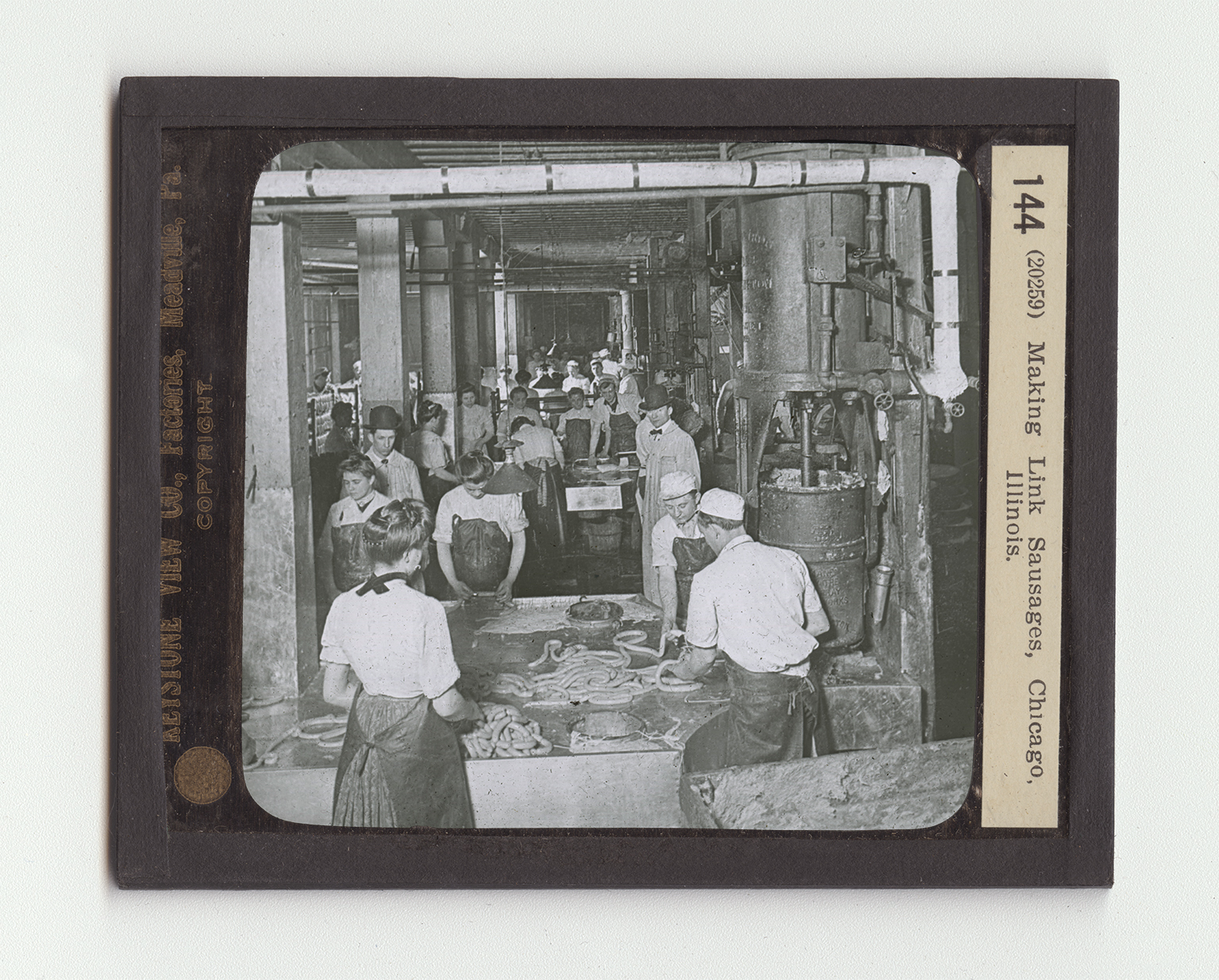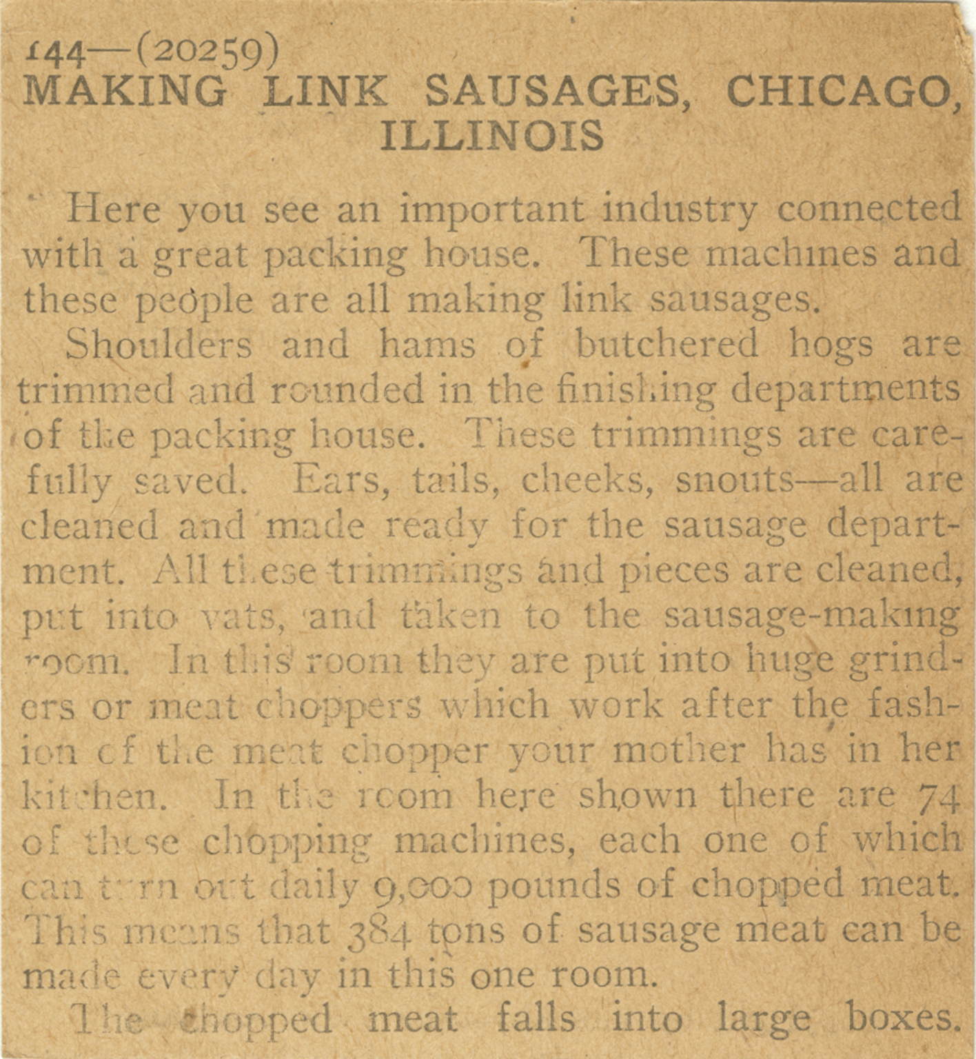 Here you see an important industry connected with a great packing house. These machines and these people are all making link sausages. Shoulders and hams of butchered bogs are trimmed and rounded in the finishing departments of the packing house. These trimmings are carefully saved. Ears, tails, cheeks, snouts—all are cleaned and made ready for the sausage department. All these trimmings and pieces are cleaned, put into vats, and taken to the sausage-making room. In this room they are put into huge grinders or meat choppers which work after the fashion of the meat chopper your mother has in her kitchen. In the room here shown there are 74 of these chopping machines, each one of which can turn out daily 9,000 pounds of chopped meat. This means that 384 tons of sausage meat can be made every day in this one room. The chopped meat falls into large boxes.