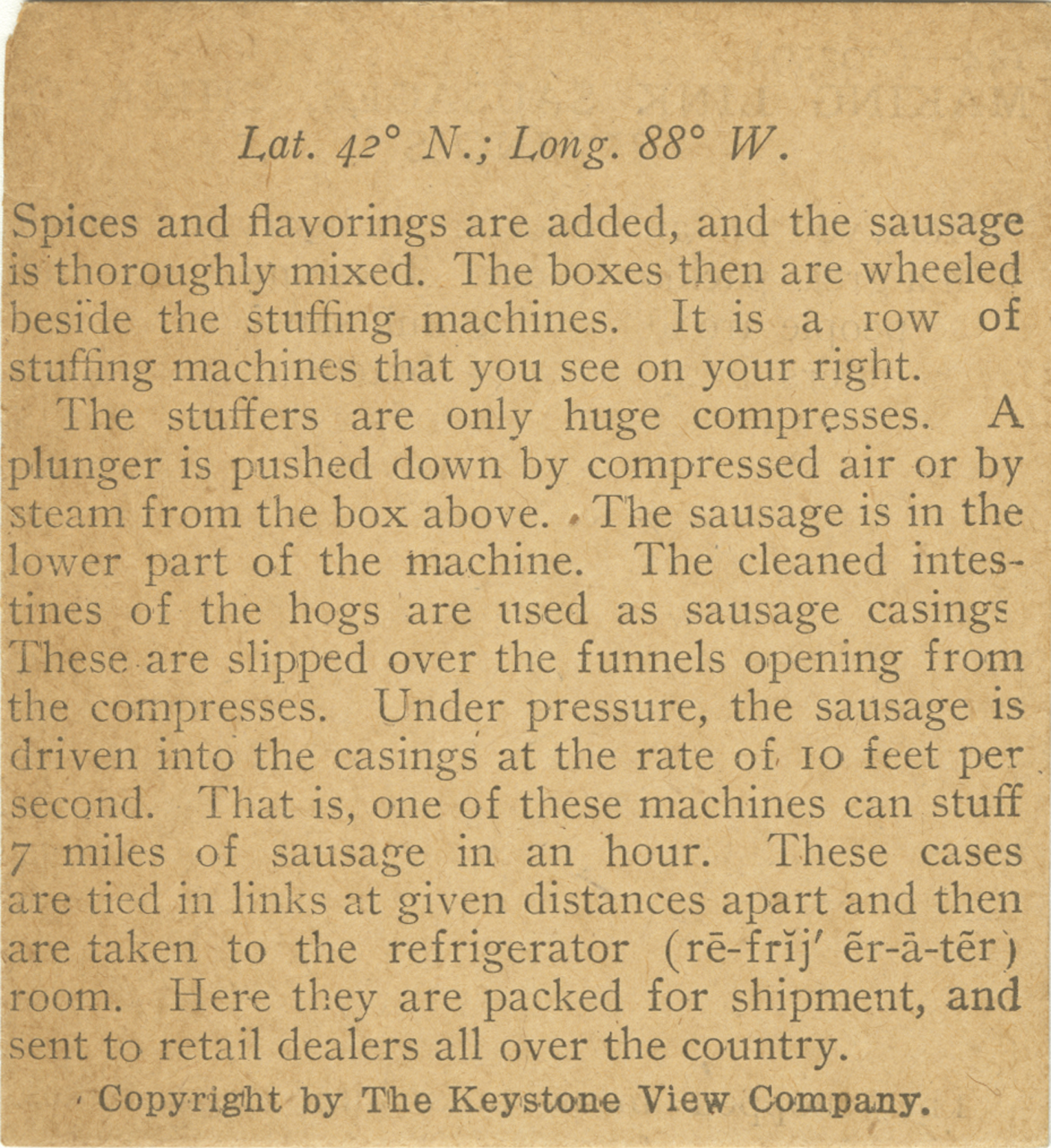 Spices and flavorings are added, and the sausage is thoroughly mixed. The boxes then are wheeled beside the stuffing machines that you see on your right. The stuffers are only huge compresses. A plunger is pushed down by compressed air or by steam from the box above. The sausage is in the lower part of the macihine. The cleaned intestines of the hogs are used as sausage casings. These are slipped over the funnels opening from the compresses. Under pressure, the sausage is driven into the casings at the rate of 10 feet per second. That is one, one of these machines can stuff 7 miles of suasuge in a hour. These cases are tied in links at given distancs apart and then are taken to the refrigerator room. Here they are packed for shipment, and sent to retail dealers all over the country.
