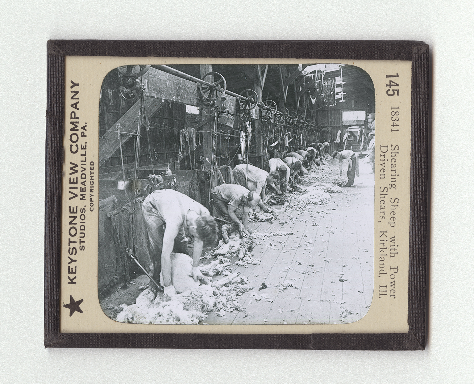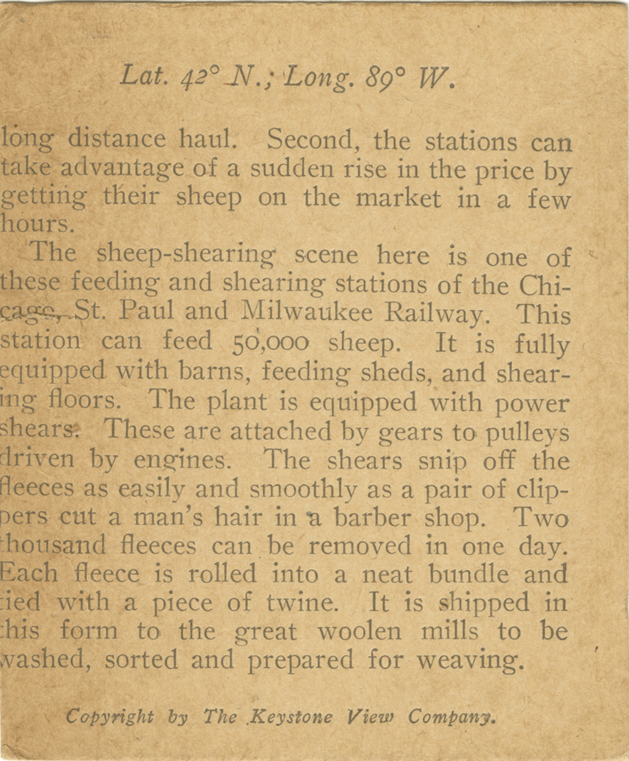 long distance haul. Second, the stations can take advantage of a sudden rise in the rpice by getting their sheep on the market in a few hours. The sheep-shearing scene here is one of these feeding and shearing stations of the Chicago, St.Paul and Milwaukee Railway. This station can feed 50,000 sheep. It is fully equipped with power shears. These are attached by gears to pulleys driven by engines. The shears snip off the fleeces as easily and smoothly as a pair of clippers cut a man's hair in a barber shop. Two thousand fleeces can be removed in one day. Each fleece is rolled into a neat bundle and tied with a piece of twine. It is shipped in this form to the great woolen mills to be washed, sorted and prepared for weaving.