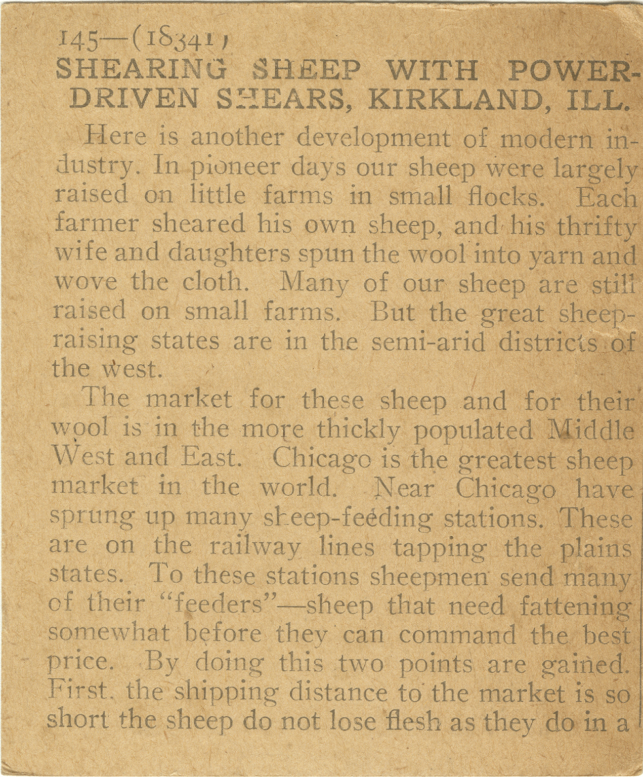 Here is another example of modern industry. In pioneer days our sheep were largely raised on little farms in small flocks. Each farmer sheared his own sheep, and his thrifty wife and daughters spun the wool into yarn and wove the cloth. Many of our sheep are still raised on small farms. But the great sheep raising states are in the semi-arid districts of the west. The market for these sheep and for their wool is the more thickly populated Middle West and East. Chicago is the greatest sheep market in the world. Near Chicago have sprung up many sheep-feeding stations. These are on the railway lines tapping the plains states. To these stations shjeepmen send many of their "feeders"--sheep that need fattening somewhate before they can command the best price. By doing this two points are gained. First, the shipping distance to the market is so short the sheep do not lose flesh as they do in a