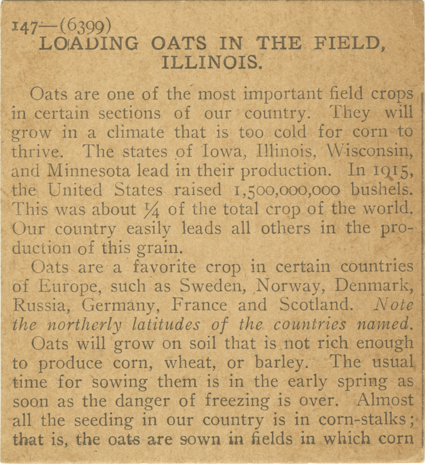 Oats are one of the most important field crops in certain sections of our country. They will grow in a climate that is too cold for corn to thrive. The states of Iowa, Illinois, Wisconsin, and Minnesota lead in their production. In 1915, the United States raised 1,500,000,000 bushels. This was about 1/4 of the total crop of the world. Our country easily leads all others in the production of this grain. Oats are a favorite crop in certain countries of Europe, such as Sweden, Norway, Denmark, Russia, Germany, France and Scotland. Note the northerly latitudes of the countries named. Oats will grow on soil that is not rich enough to produce corn, wheat, or barley. The usual time for sowing them is in the early spring as soon as the danger of freezing is over. Almost all the seeding in our country is in corn-stalks; that is, the oats are sown in fields in which corn