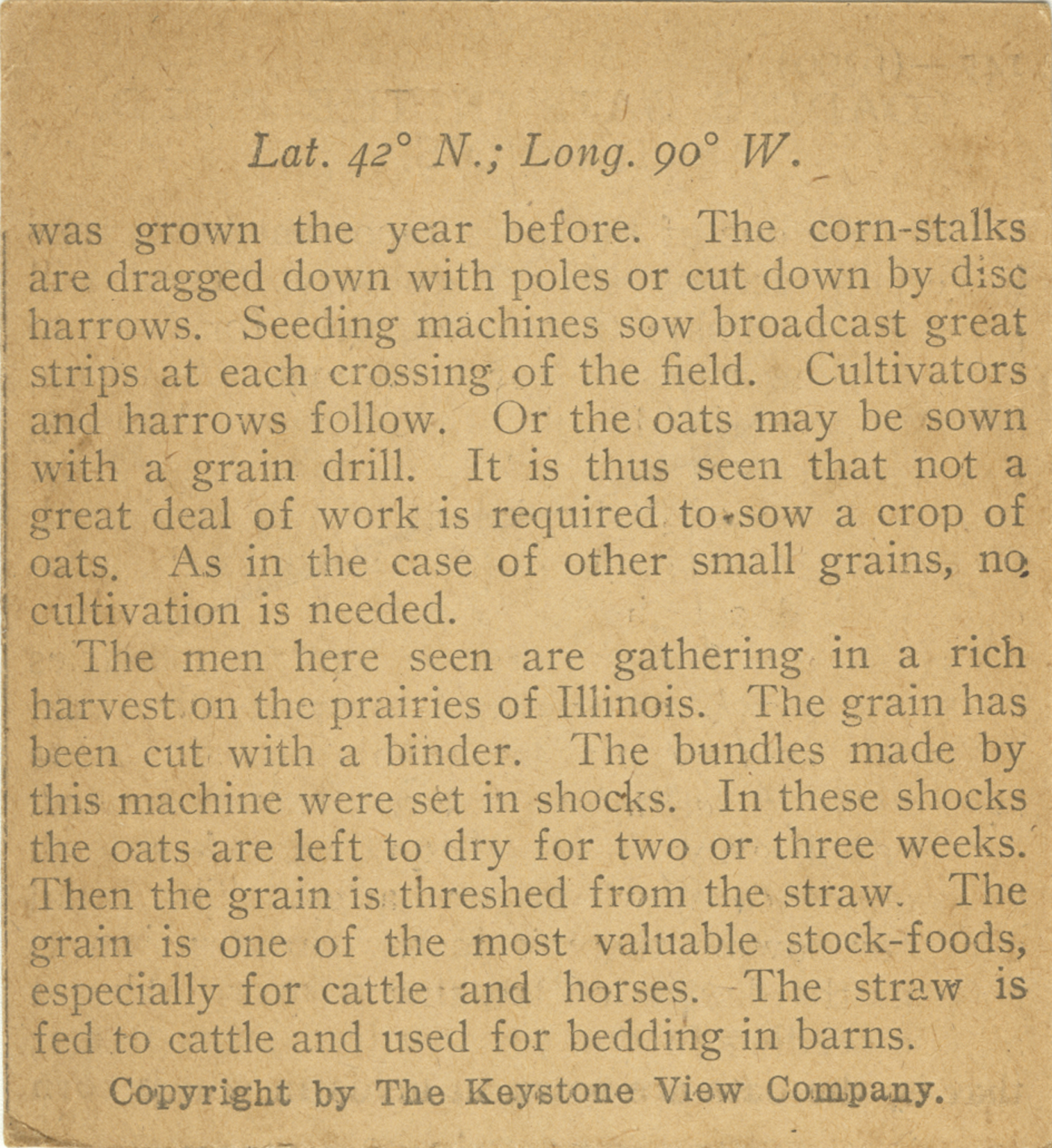 was grown the year before. The corn-stalks are dragged down with poles or cut down by disc harrows. Seeding machines sow broadcast great strips at each crossing of the field. Cultivators and harrows follow. Or the oats may be sown with a grain drill. It is thus seen that not a great deal of work is required to sow a crop of oats. As in the case of other small grains, no cultivation is needed. The men here seen are gathering in a rich harvest on the prairies of Illinois. The grain has been cut with a binder. The bundles made by this machine were set in shocks. In these shocks the oats are left to dry for two or three weeks. Then the grain is threshed from the straw. The grain is one of the most valuable stock-foods, especially for cattle and horses. The straw is fed to cattle and used for bedding barns.
