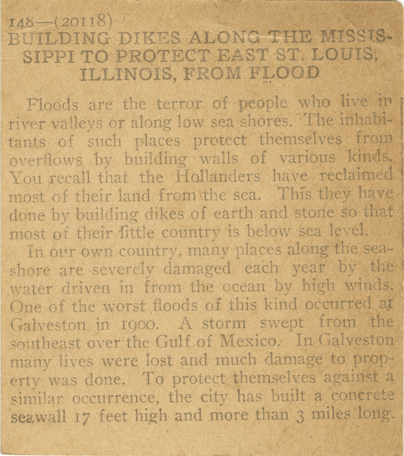 Floods are the terror of people who live in river valleys or along low sea shores. The inhabitants of such places protect themselves from overflows by building walls of various kinds. You recall that the Hollanders have reclaimed most of their land from the sea. This they have done by building dikes of earth and stone so that most of their little country is below sea level. In our country, many places along the seashore are severly driven in from the ocean by high winds. One of the worst floods of this kind occured at Galvenston in 1900. A storm swept from the southeast over the Gulf of Mexico. In Galvenston many lives were lost and much damage to property was done. To protect themselves against a similar occurence, the city has built a concrete seawall 17 feet high and more than 3 miles long.