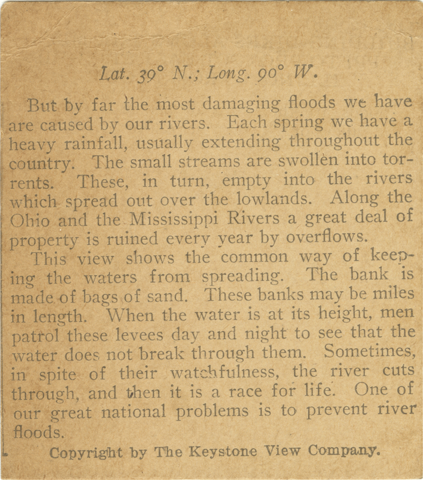 But by far the most damaging floods we have are caused by our rivers. Each spring we have a heavy rainfall, usually extending throughout the country. The small streams are swollen into torrents. These, in turn, empty into rivers which spread out over the lowlands. Along the Ohio and the Mississippi Rivers a great deal of property is ruined every year by overflows. This view shows the common way of keeping the waters from spreading. The bank is made of bags of sand. These banks may be miles in length. When the water is at its height, men patrol these levees day and night to see that the water does not break through them. Sometimes, in spite of their watchfulness, the river cuts through, and then it is a race for life. One of our great national problems is to prevent river floods.