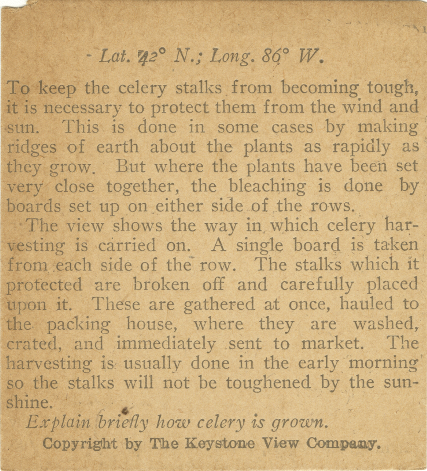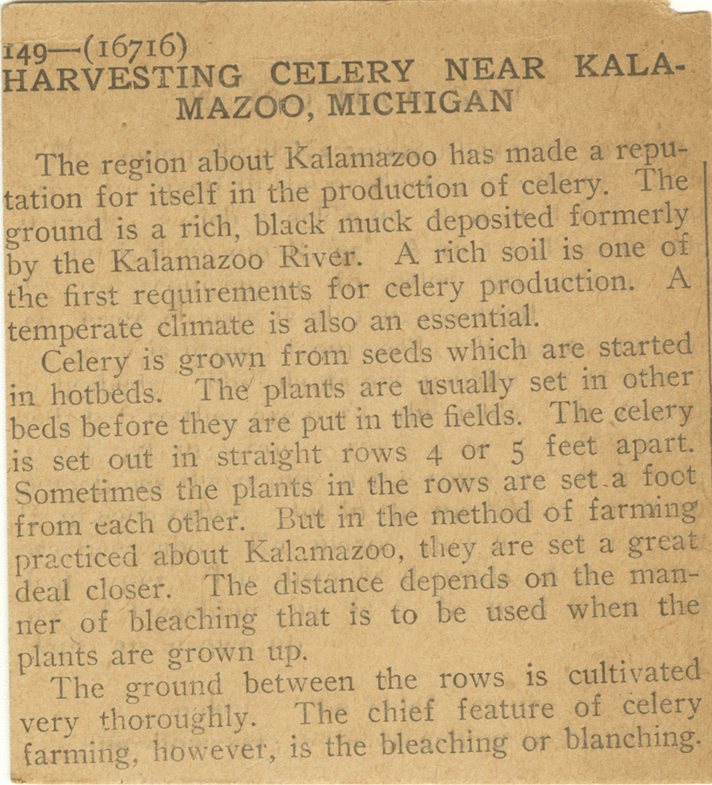 The region about Kalamazoo has made a reputation for itself in the production of celery. The ground is rich, black much deposited formerly by the Kalamazoo River. A rich soil is one of the first requirements for celery production. A temperate climate is also an essential. Celery is grown from seeds which are started in hotbeds. The plants are usually set in other beds before they are put in the fields. The celery is set out in straight rows 4 or 5 feet apart. Sometimes the plants in the rows are set a foot from each other. But in the method of farming practiced about Kalamazoo, they are set a great deal closer. The distance depends on teh manner of bleaching that is to be used when plants are grown up. The ground between the rows is cultivated very thoroughly. The chief feature of celery farming, however, is the bleaching or blanching.