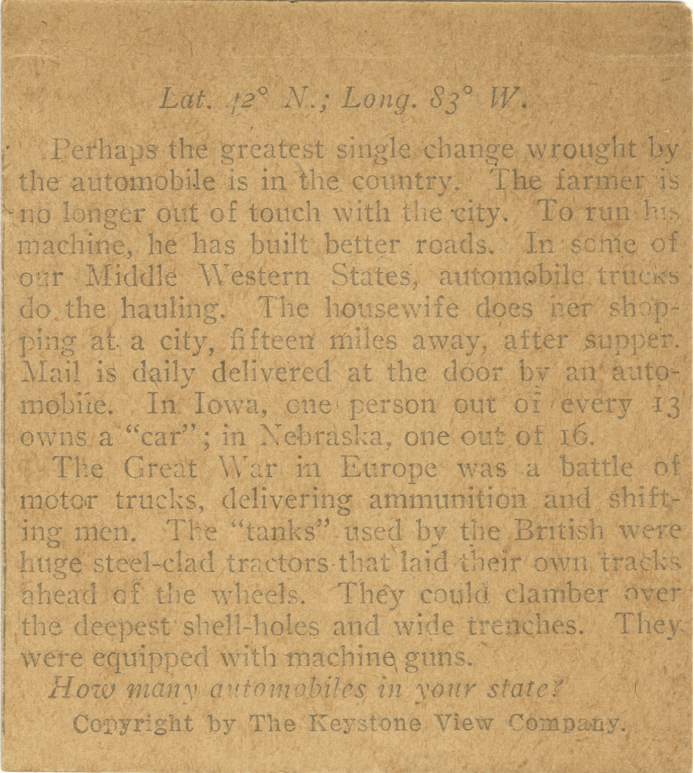 Perhaps the greatest single change wrought by the automobile is in the country. The farmer is no logner out of touch with the city. To run his machine, he has built better roads. In some of our Middle Western States, automobile trucks do the hauling. The housewife does her shopping at a city, fifteen miles away, after supper. Mail is daily delivered at the door by an automobile. In Iowa, one person out of every 13 owns a "car"; in Nebraska, one out of 16. The Great War in Europe was a battle of motor trucks, delivering ammunition and shifting men. The "tanks" used by the British were huge steel-clad tractors that laid their own tracks ahead of the wheels. They could clamber over the deepest shell-holes and wide trenches. They were equipped with machine guns. How many automobiles in your state?