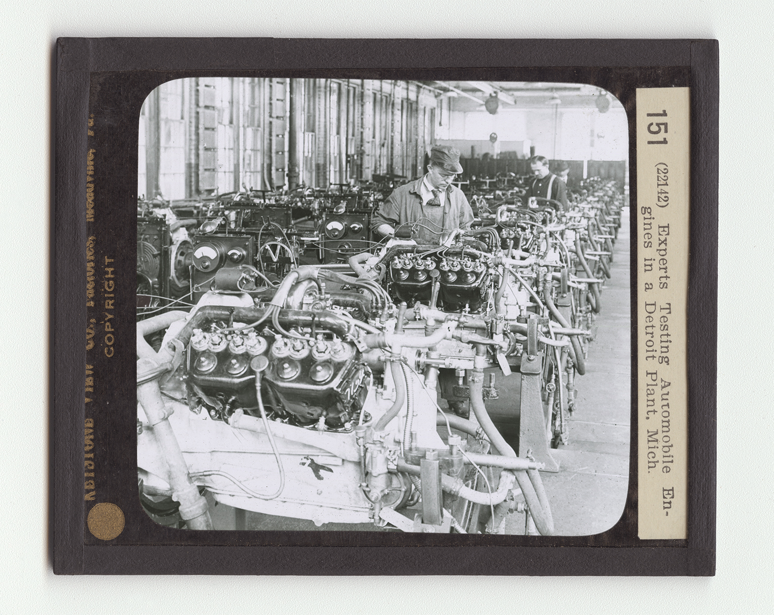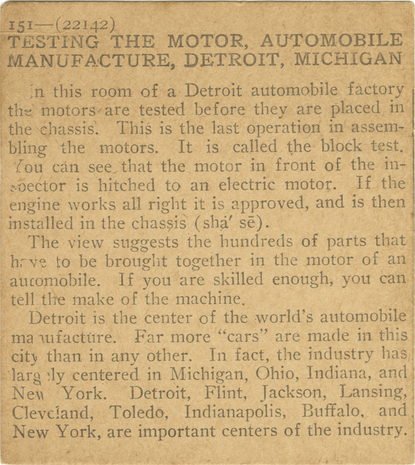 In this room of a Detroit automobile factory the motors are tested before they are placed in the chassis. This is the last operation in assembling the motors. It is called the block test. You can see that the motor in front of the inspector is hitched to an electric motor. If you are skilled enough, oyu can tell the make of the machine. Detroit is the center of the world's automobile manufacture. Far more "cars" are made in this city than in any other. In fact, the industry has largely centered in Michigan, Ohio, Indiana, and New York. Detroit, Flint, Jackson, Lansing, Cleveland, Toledo, Indianapolis, Buffalo, and New York, are important centers of the industry.