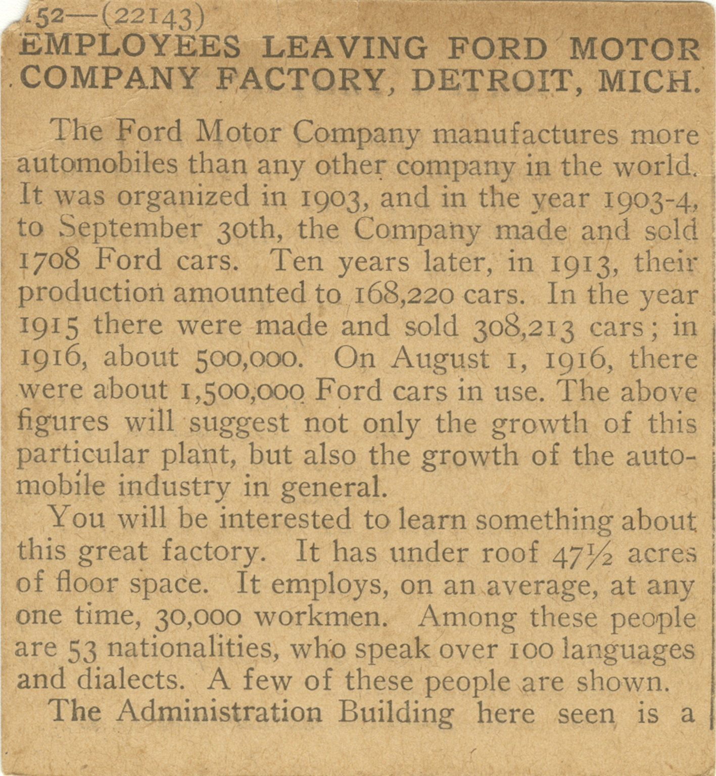 The Ford Motor Company manufactures more automobiles than any other company in the world. It was organized in 1903, and in the year 1903-4, to September 30th, the Company made and sold 1708 Ford cars. Ten years later, in 1913, their production amounted to 168,220 cars. In the year 1915, about 500,000. On August 1, 1916, there were about 1,500,000 Ford cars in use. The above figures will suggest not only the growth of this particular plant, but also the growth of the automobile industry in general. You will be interested to learn something about this great factory. It has under roof 47 1/2 acres of floor space. It employs, on an average, at any one time, 30,000 workmen. Among these people are 53 nationalities, who speak over 100 languages and dialects. A few of these people are shown. The Administration Building here seen is a