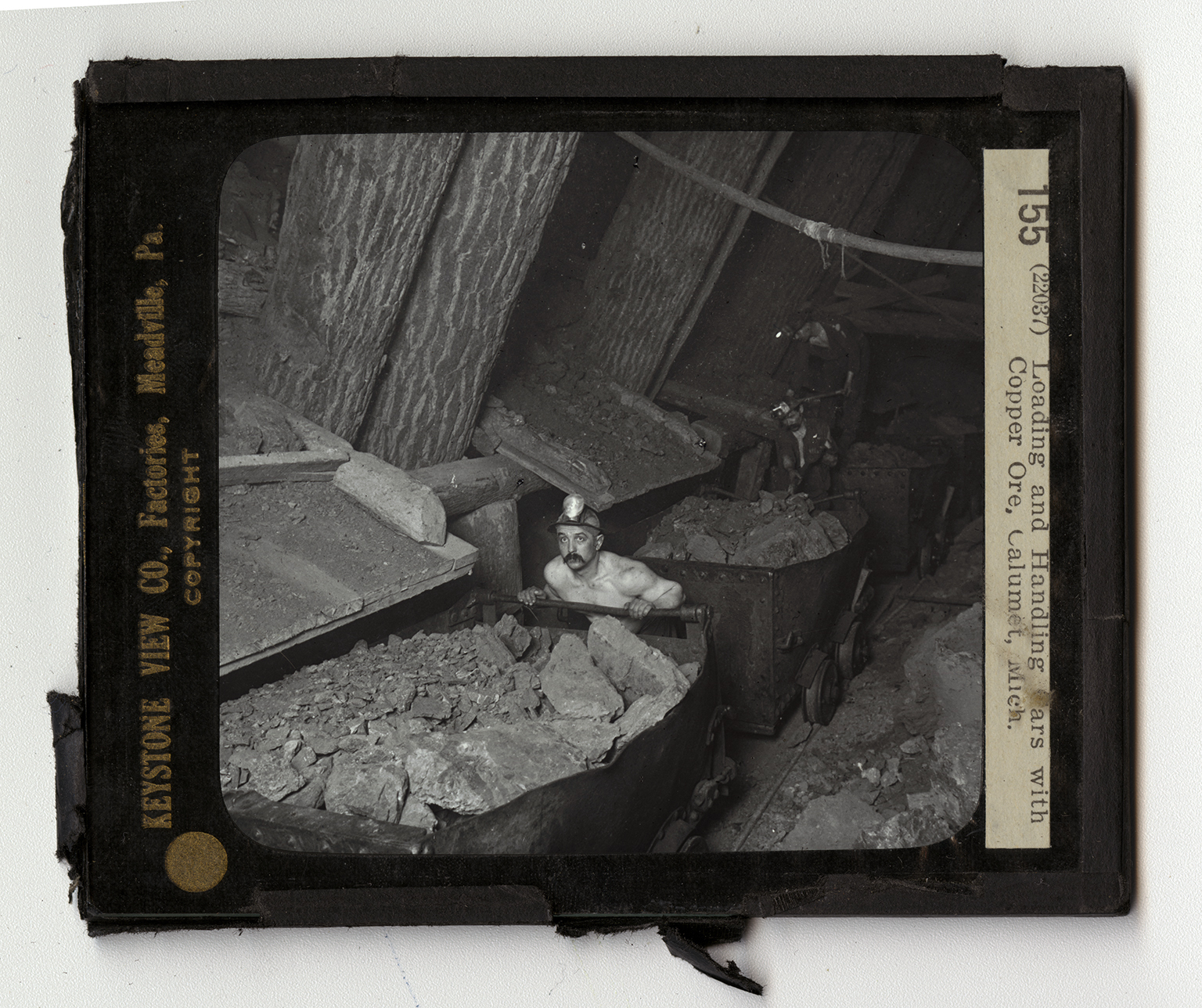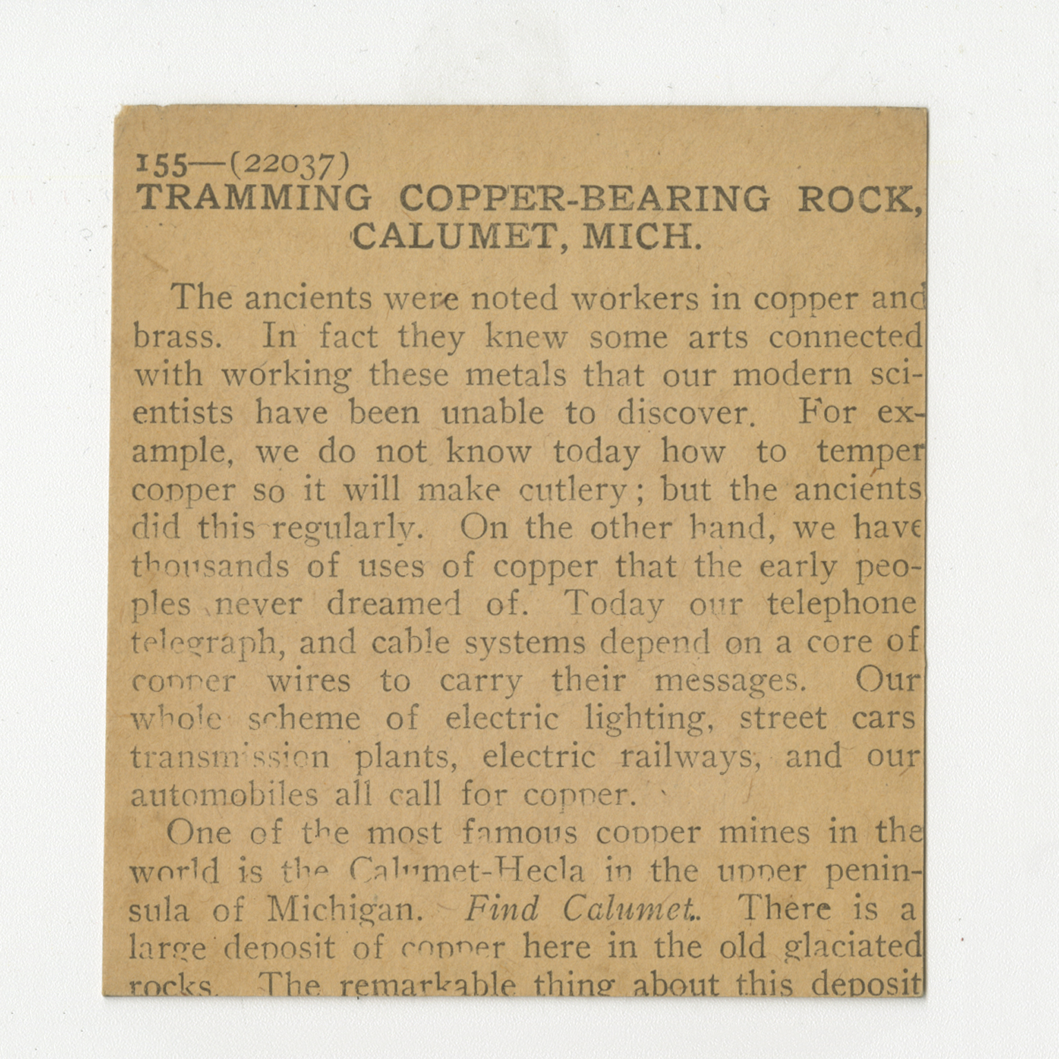 is that some of the copper is pure; that is, it is mined in large pieces of copper unmixed with other elements. The Indians knew of this copper for some of it cropped out on the surface. They worked it for some of their ornaments. Now this vein is tapped by shafts, one of which is 5,700 feet long. Another taps the lode 2,543 feet below the surface. Another shaft is 4,800 feet straight up and down. The copper-bearing rock is drilled by machines, and blasted loose by dynamite. The mine is stoped; that is, cut into steps or ledges so it can be wokred at different layers. These stopes are tapped by slanting chutes into which the rock is put. The rock slides down into the tram cars such as you see here. What are the heavy timbers for? How would you like to work a mile underground?