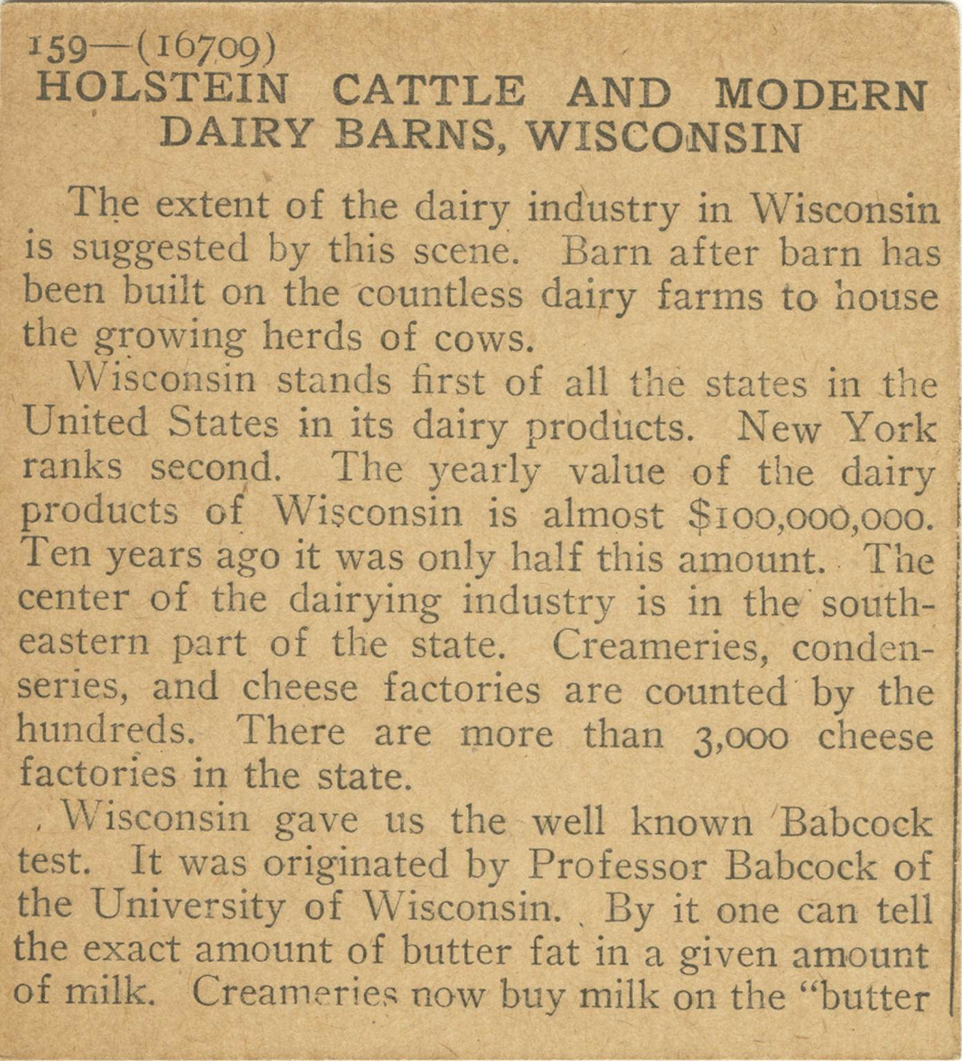 The extent of the dairy industry in Wisconsin is suggested by this scene. Barn after barn has been built on the countless dairy farms to house the growing herds of cows. Wisconsin stands first of all the states in the United States in its dairy products. The yearly value of the dairy products of Wisconsin is almost $100,000,000. Ten years ago it was only half this amount. The center of the dairying industry is in the southeastern part of the state. Creameries, condenseries, and cheese factories are counted by the hundreds. There are more than 3,000 cheese factories in the state. Wisconsin gave us the well known Babcock test. It was origniated by Professor Babcock of the UNiversity of Washington. By it one can tell the exact amount of butter fat in a given amount of milk. Creameries now buy milk on the "butter