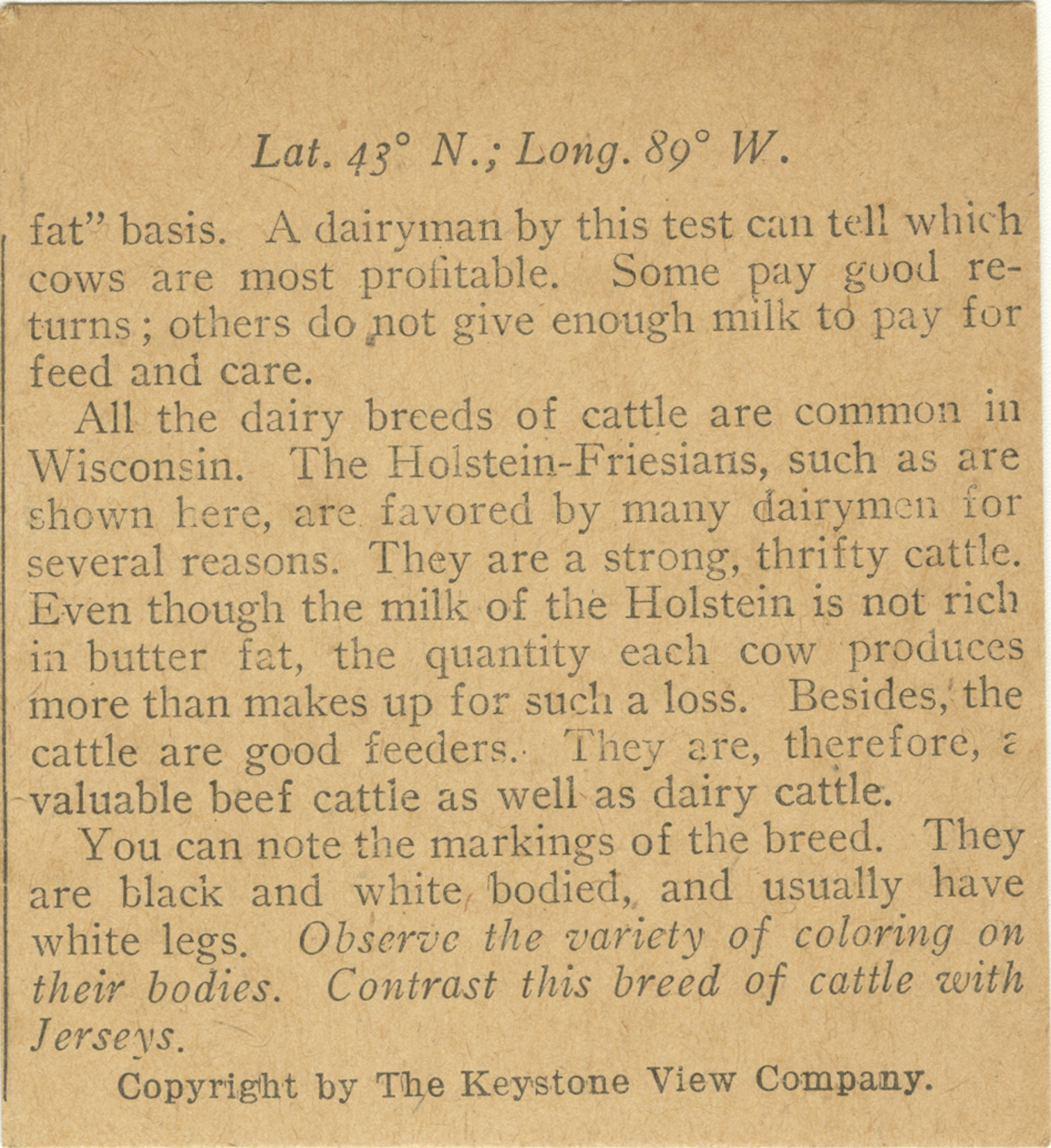 fat" basis. A dairyman by this test can tell which cows are most profitable. Some pay good returns; others do not give enough milk to pay for feed and car. All the dairy breeds of cattle are common in Wisconsin. The Holstein-Friesians, such as shown here, are favored by many dairymen for several reasons. They are a strong, thrify cattle. Even though the milk of the Holstein is not rich in butter fat, the quantity each cow produces more than makes up for such a loss. Besides, the cattle are good feeders. They are, therefore, a valuable beef cattle as well as dairy cattle. You can note the markings of the breed. THey are black and white bodied, and usually have white legs. Observe the variety of coloring on their codies. Contrast this breed of cattled with Jerseys.