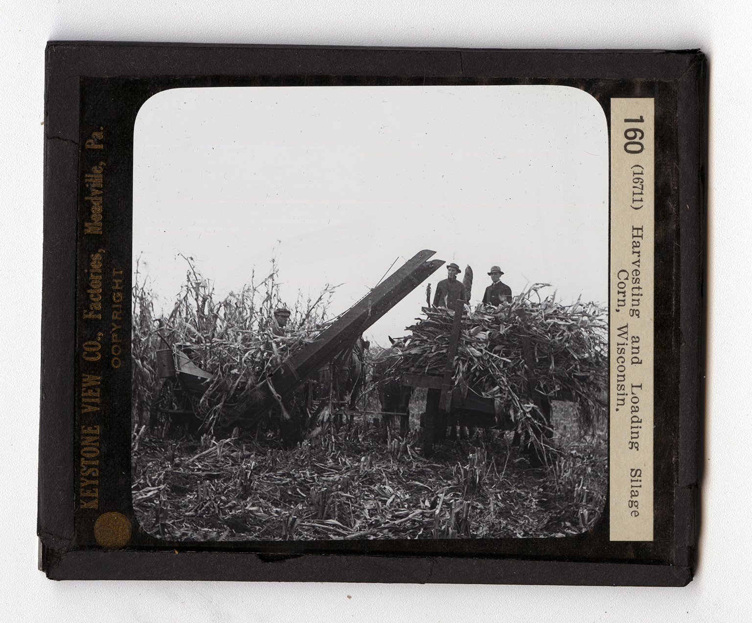 to make feeding easy. Feeding takes place from the top of each day, so but little of the silage is exposed, and that for only a short while. The big shredders tear up loads of corn in a few minutes. There must be some machine in the cornfield that cuts and loads the corn as fast as the shredder handles it. The machine you see here is used for that purpose. It is a corn harvester and elevator combined. It is pulled by horses, so that a big drive wheel furnaces the power to run the machinery. A sickle cuts off the stalks, and these are carried to the top of the elevtor by a revolved canvas. The stalks fall on a wago which is hitched closely to the harvester. One man loads the stalks, while the other drives the wagon. Find out all you can about silos from farmers or farm journals.