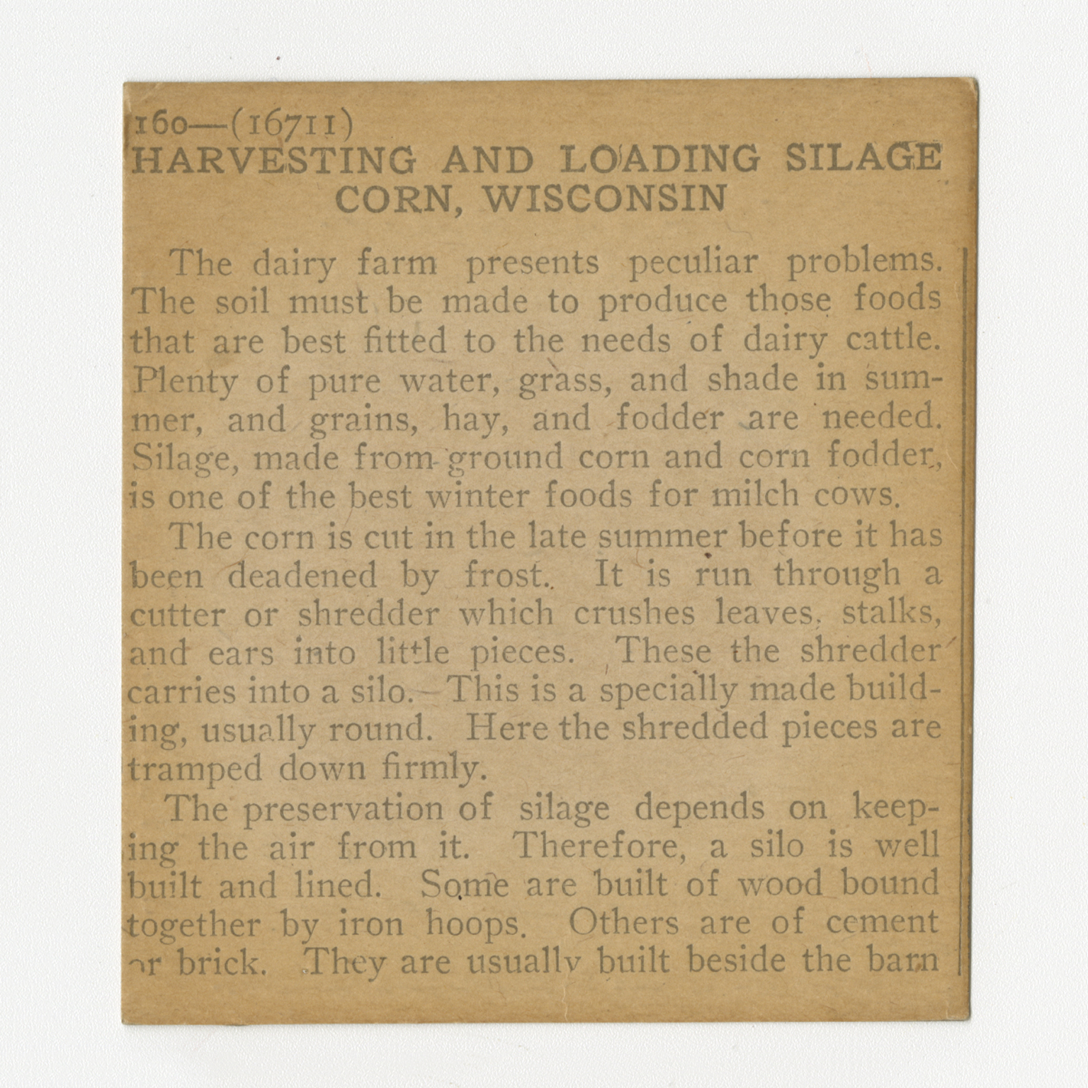 The dairy farm presents peculiar problems. The soil must be made to produce those foods that are best fitted to the needs of dairy cattle. Plenty of pure water, grass, and shade in the summer, and grains, hay, and fodder are needed. Silage, made from ground-up corn and corn fodder, is one of the best winter foods for milch cows. The corn is cut in the late summer before it has been deadened by the frost. It is run through a cutter or shredder which crushes leaves, stalks, and ears into little pieces. These the shredder carriers into a silo. This a specially made building, usually round. Here the shredded pieces are tramped down firmly. The preservation of silage depends on keeping the air from it. Therefore, a silo is well built and lined. Some are built of wood bound together by iron hoops. Others are of cement or brick. They are usually built beside the barn
