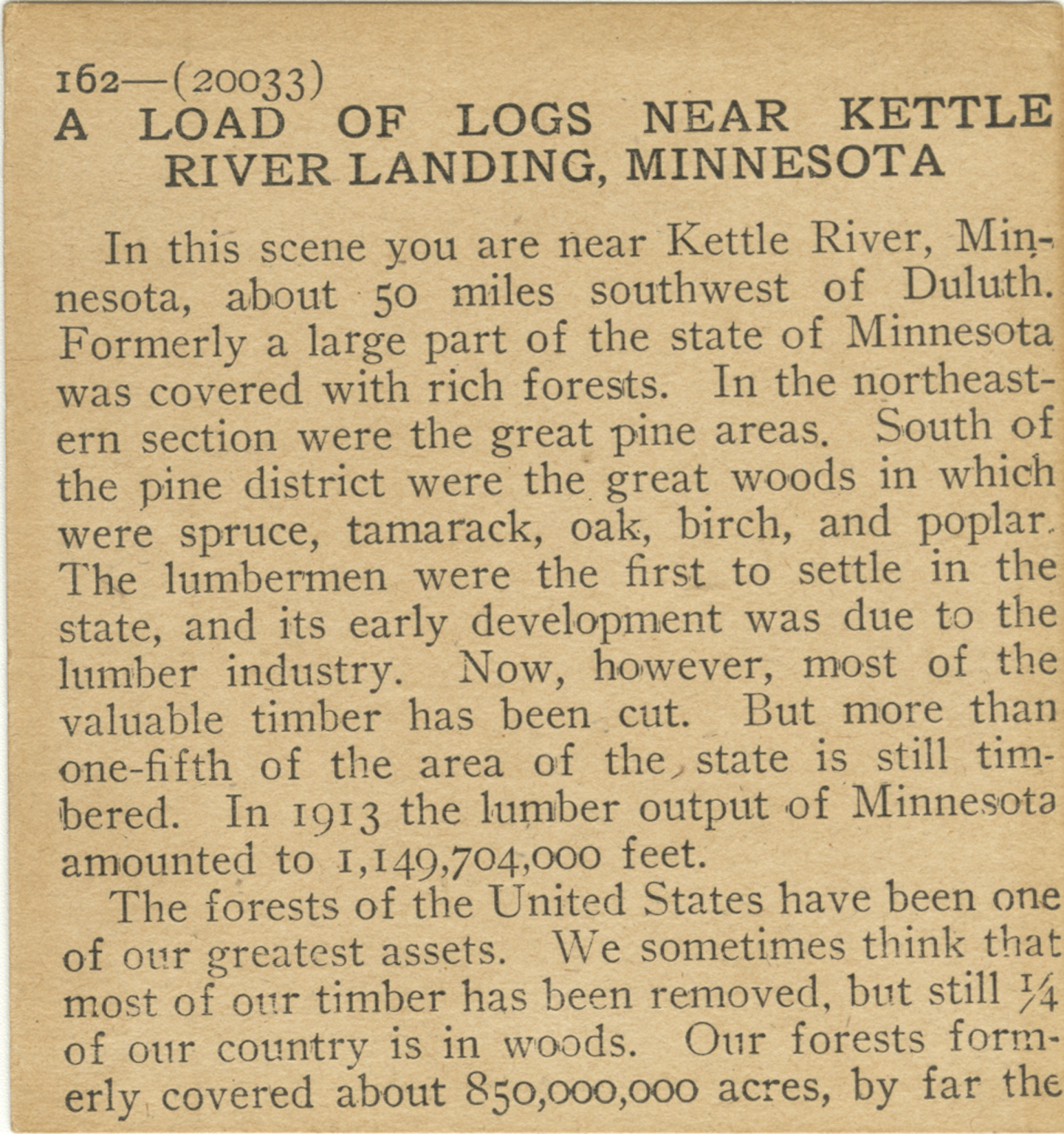 In this scene you are near Kettle River, Minnesota, about 50 miles southwest of Duluth. Formerly a large part of the state of Minnesota was covered with rich forests. IN the northeastern section were the great pine areas. South of the pine district were the great woods in which were spruce, tamarack, oak, birch, and poplar. The lumbermen were the first to settle in the state, and its early development was due to the lumber industry. Now, however, most of the valuable timber has been cut. But more than one-fifth of the area of the state is still timbered. In 1913 the lumber output of Minnesota amounted to 1,149,704,00 feet. The forests of the United States have been one of our greatest assest. We sometimes think that most of our timber has been removed, but still 1/4 of our country is in woods. Our forests formerly covered about 850,000,000 acres by far the