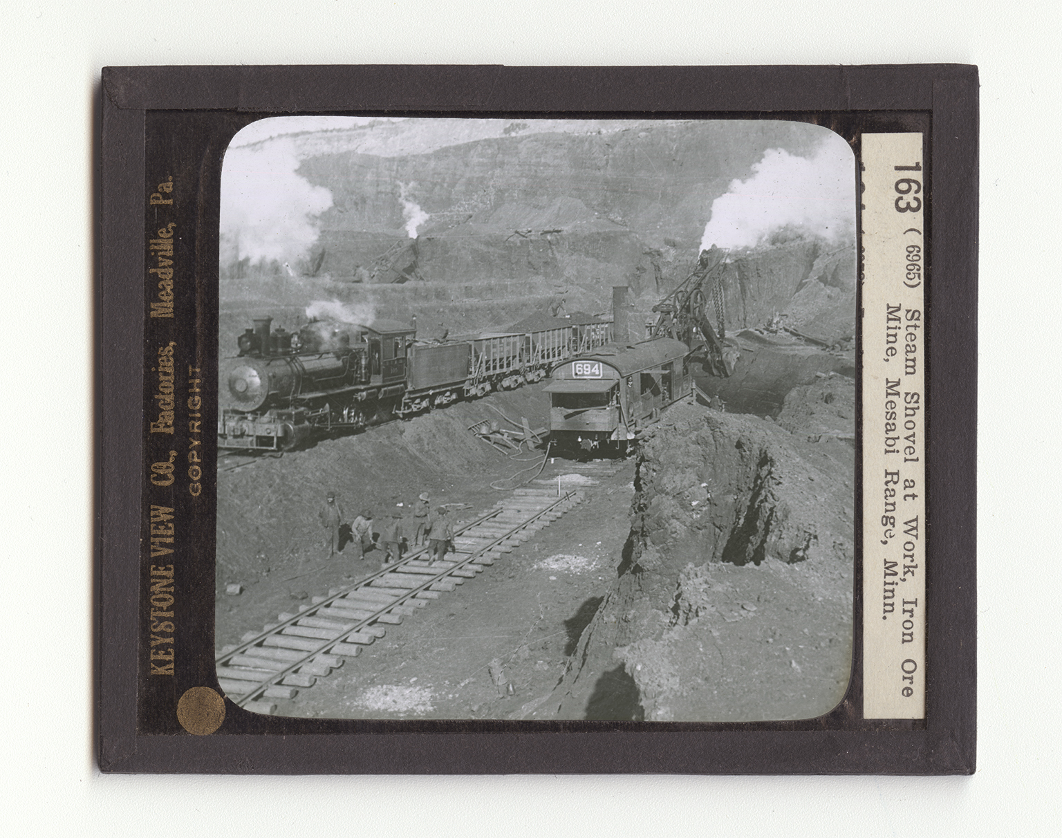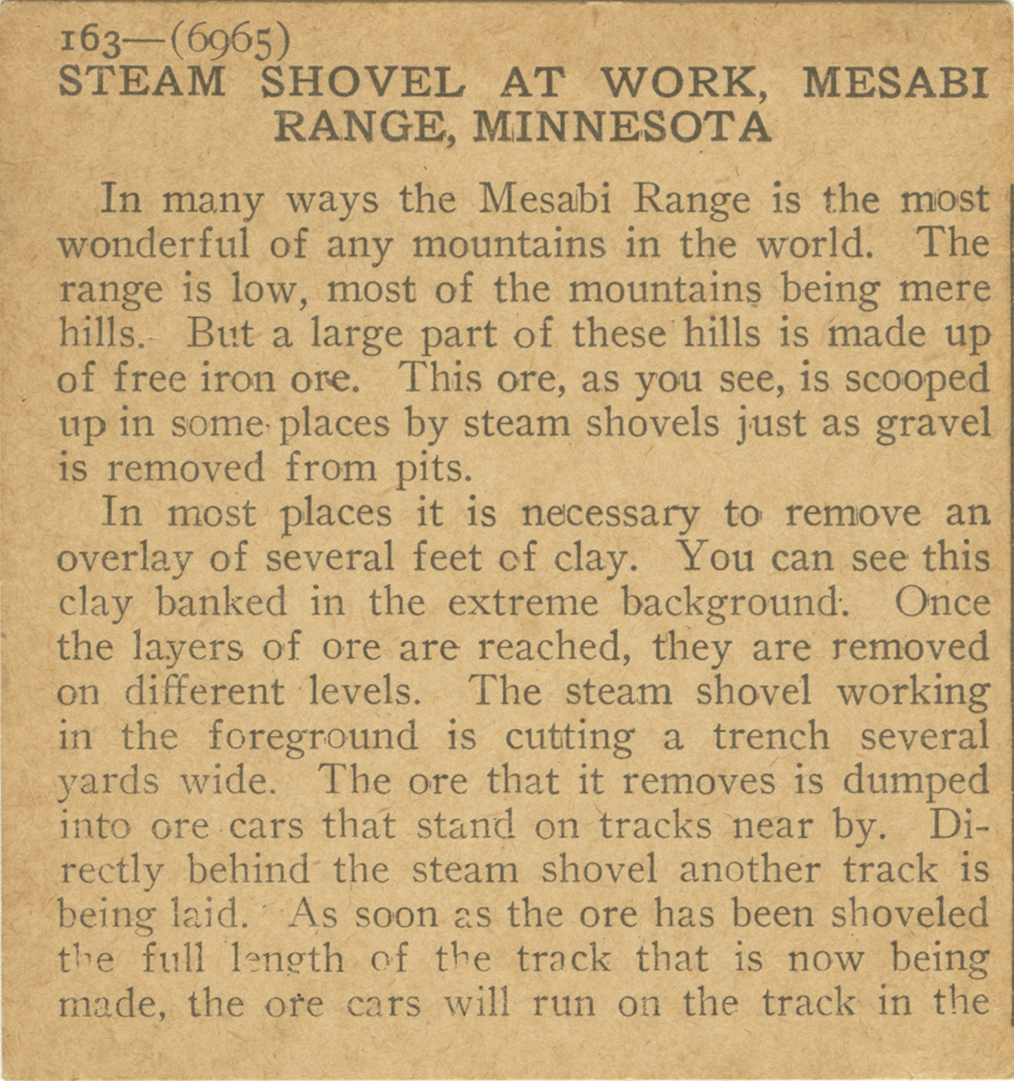 In many ways the Mesabi Range is the most wonderful of any mountains in the world. The range is low, most of the mountains being mere hills. But a large part of the these hills is made up of free iron ore. This ore, as you see, is scooped up in some places by steam shovels just as gravel is removed from pits. In most places it is necessary to remove an overlay of several feet of clay. You can see this clay banked in the extreme background. Once the layers of ore are reached, they are removed on different levels. The steam shovel working the foreground is cutting a trench several yards wide. The ore that it removes is dumped into ore cars that stand on tracks near by. Directly behind the steam shovel another track is being laid. As soon as the ore has been shoveled the full length of the track that is now being made, the ore cars will run on the track in the